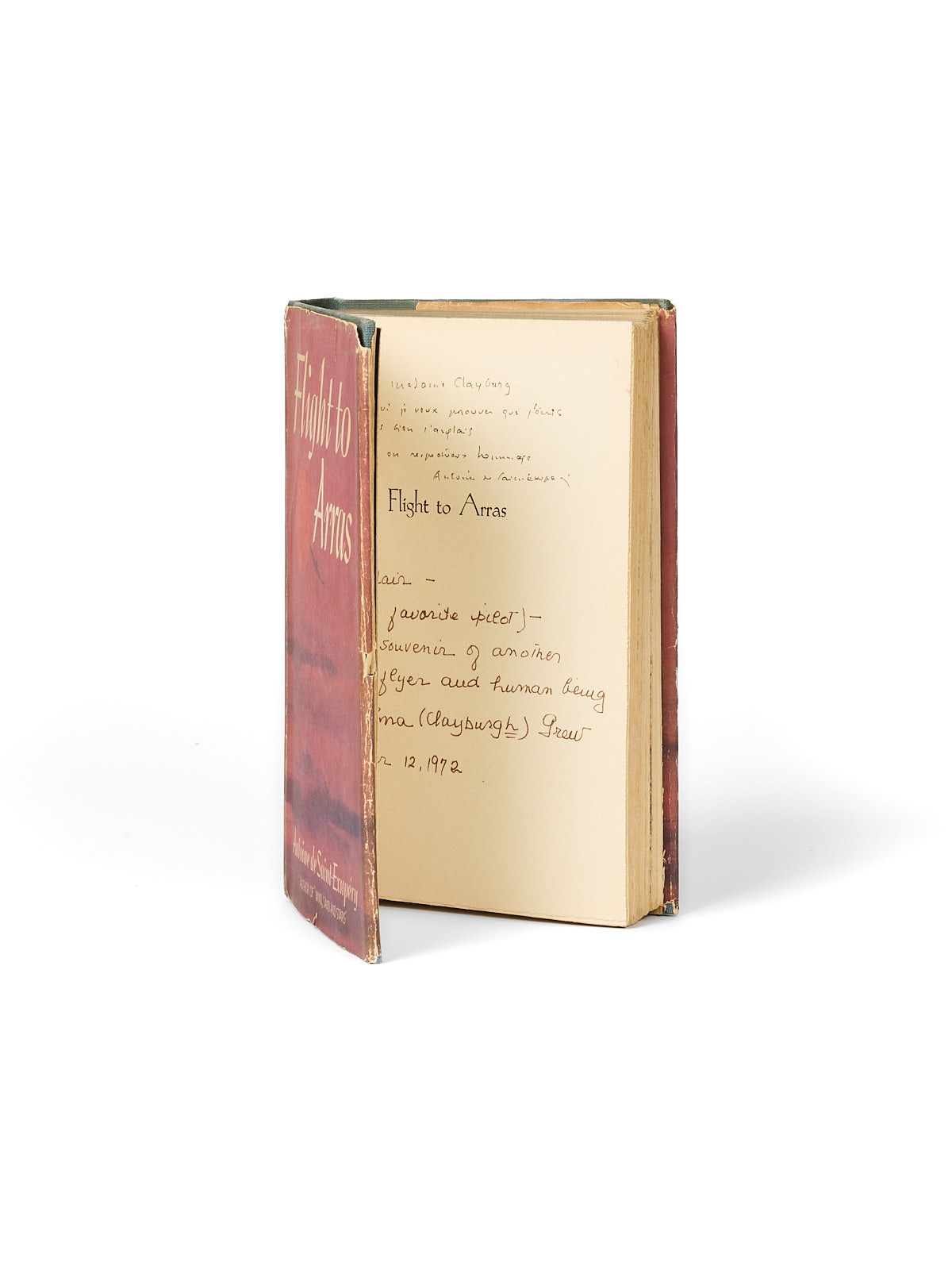 Alma Clayburg-Grew, sans doute bien des années plus tard, en souvenir de Saint-Exupéry, offrit enfin l’exemplaire à un certain Adair, son « pilote favori ». En insistant dans sa signature sur la lettre oubliée au nom de sa mère par l’auteur du Petit Prince, lequel avait prouvé qu’il pouvait certes bien écrire l’anglais, mais être moins attentif à la graphie du patronyme de ses invités !