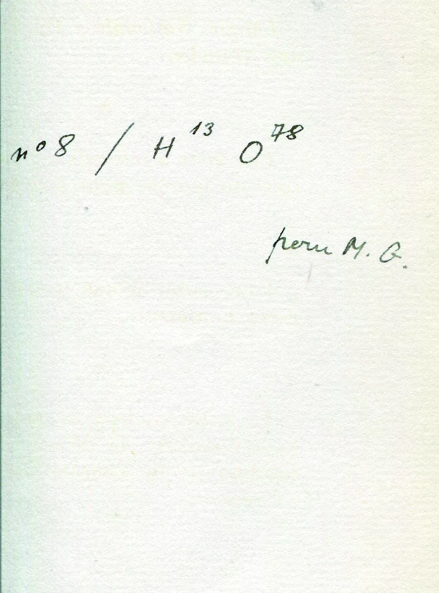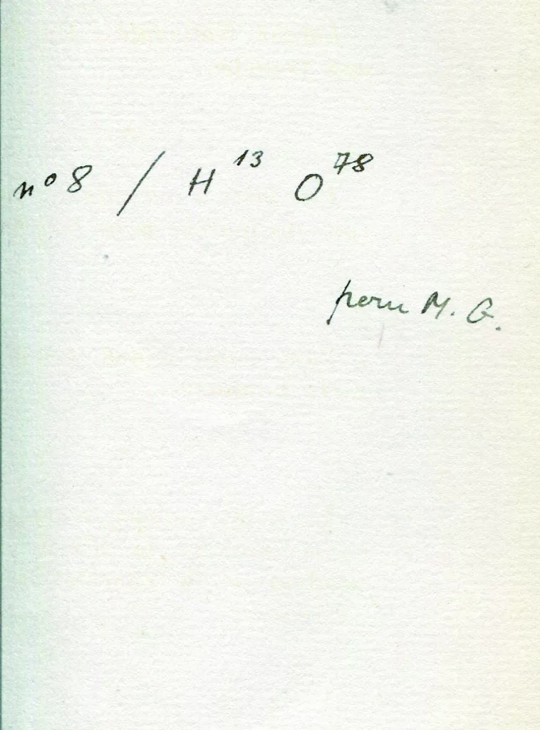 Cet exemplaire est celui de Michel Gallimard, avec cette justification : " n° 8 / H13 O78 pour M.G.", qui permet (enfin) de préciser le tirage exact de la plaquette, dont il est rarement fait mention d'exemplaires de tête - sinon d'une vague indication de "quelques exemplaires" - les exemplaires ordinaires ("O") sur alfa ne mentionnant jamais l'existence d'exemplaires sur Hollande ("H").