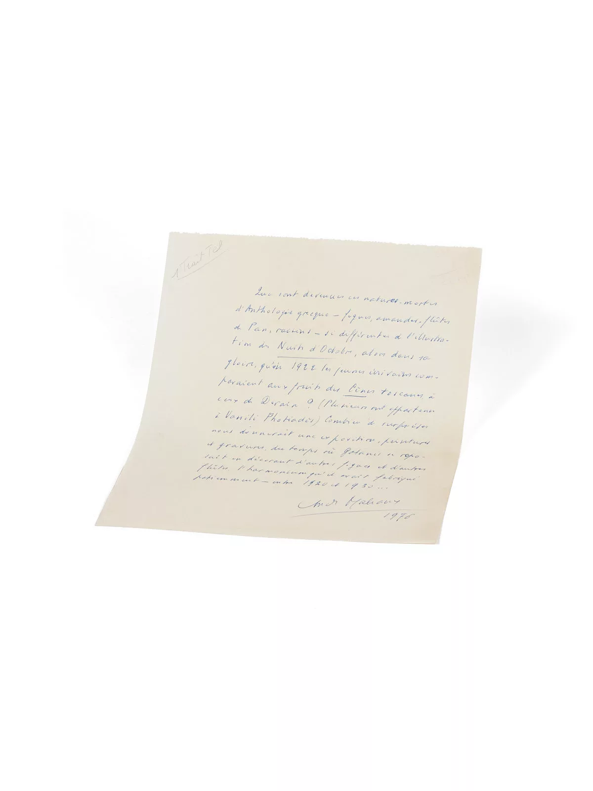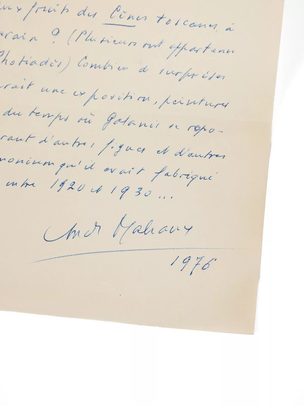 Malraux rédigera ce texte, qui constituent l’une de ses dernières publications, quelques mois avant sa mort, le 23 novembre, en l’honneur de son ami. Un texte mélancolique et respectueux, qui sera reproduit en fac-similé en tête du catalogue de l’Hommage à Demetrius Galanis organisé du 1er juin au 18 septembre 1976 par le Centre culturel hellénique de Paris, au musée de Montmartre justement.