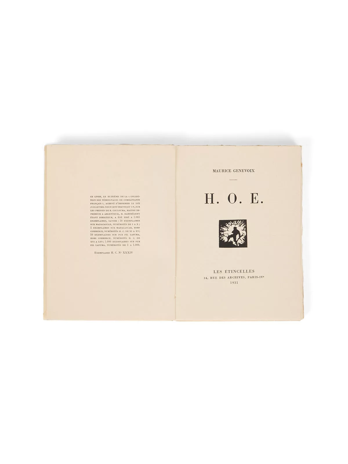 Dans sa contribution, Genevoix revient sur les jours qui suivirent sa grave blessure du 25 avril 1915, lors de l’attaque de la Tranchée de Calonne à la butte des Éparges. Le titre H.O.E. renvoie aux Hôpitaux d’Origine d’Étapes, structures intermédiaires d’évacuation et de soins. Genevoix sera déclaré invalide à 80 %.