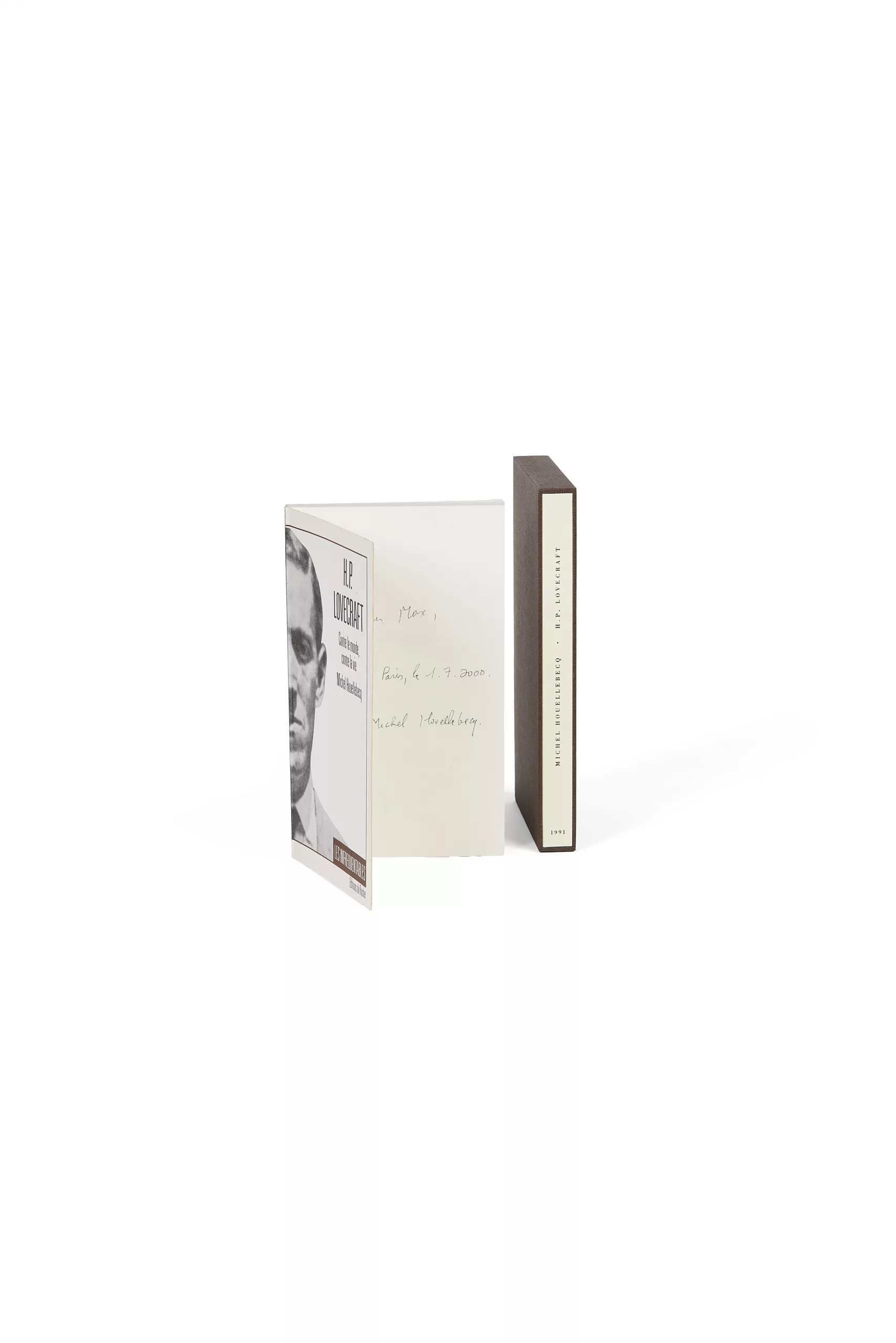 Édition originale (sans grand papier). Envoi signé : « Pour Max, à Paris, le 1.7.2000. Michel Houellebecq ».