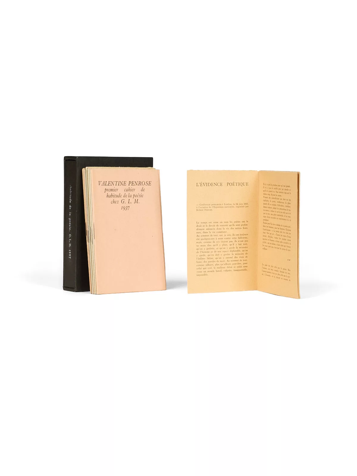 Tous ces textes sont des éditions originales hormis celui de Georges Hugnet, préface parue cinq ans plus tôt pour L’Apocalypse de S.W. Hayter (ed. Jeanne Bucher). Quant au premier fascicule (non numéroté) de ces cahiers, L’Évidence poétique de Paul Éluard, il s’agit du texte d’une conférence donnée en 1936 à l’Exposition surréaliste de Londres organisée par Roland Penrose.