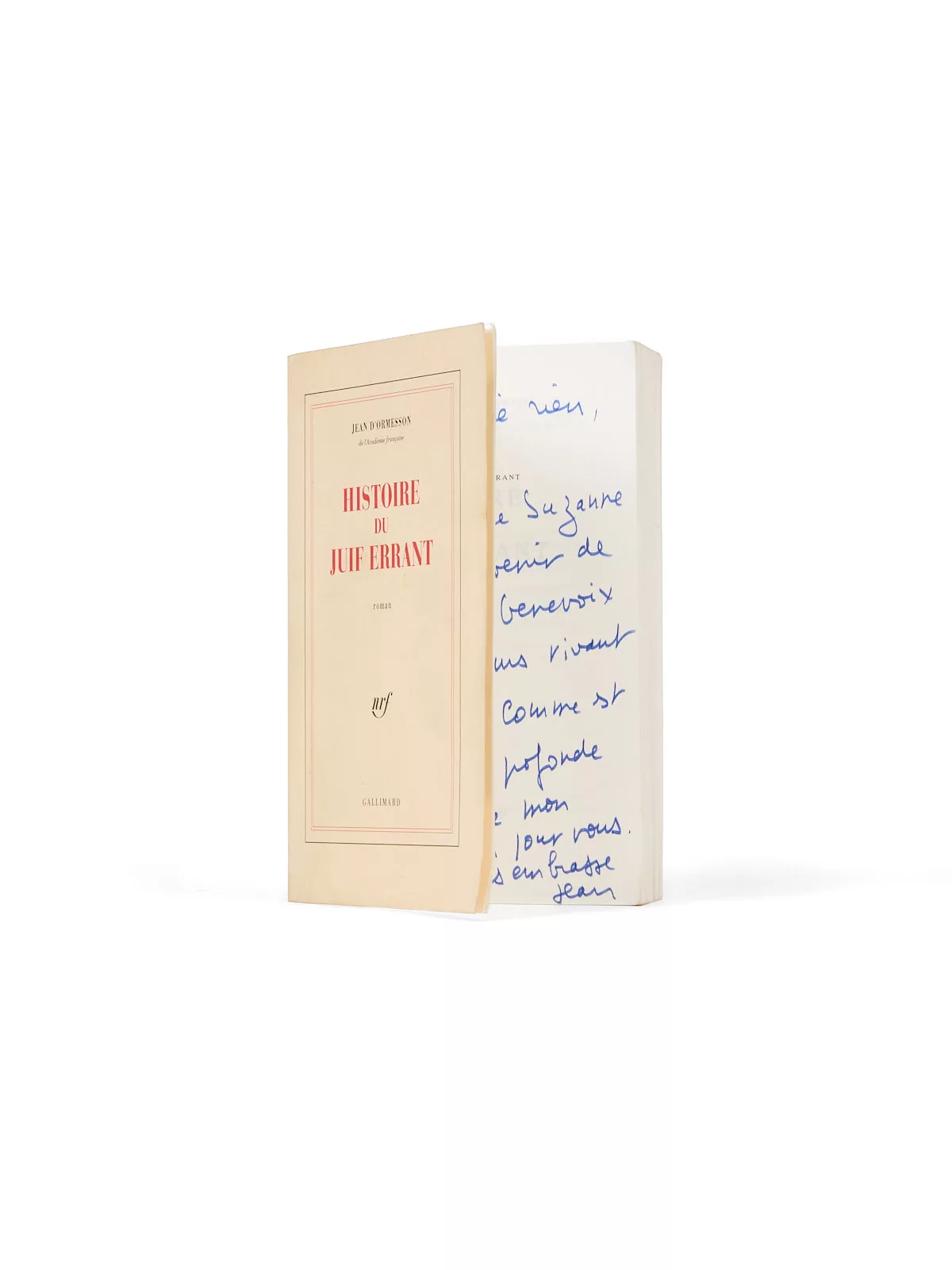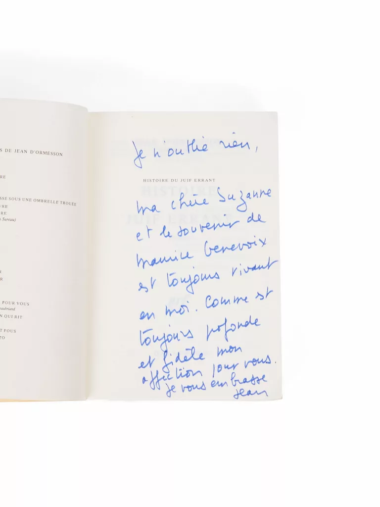 Envoi signé : « Je n'oublie rien, ma chère Suzanne et le souvenir de Maurice Genevoix est toujours vivant en moi. Comme est toujours profonde et fidèle mon affectation pour vous. Je vous embrasse, Jean. »