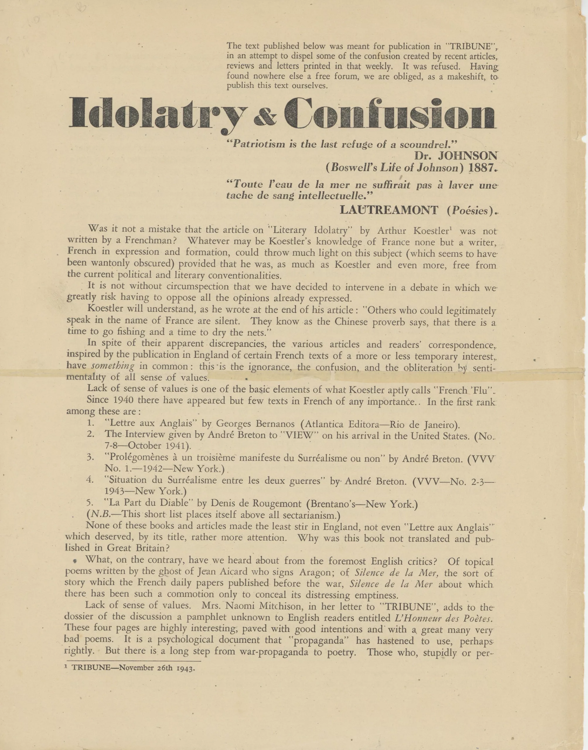 Ce brûlot incendiaire, refusé par la revue Tribune, et publié par Jacques B. Brunius et E.L.T. Mesens en mars 1944, fait le point sur la reconnaissance critique de la littérature française en Angleterre et dénonce « le marché noir de la littérature résistante, fustigeant tous les critiques anglais ». Aragon est « le Déroulède des faubourgs » et les auteurs de ce tract tiennent une position surréaliste radicale qui exclut tout compromis, toute fadeur et tout intrus. L’éditeur Toni del Renzio rebaptisé « Ranci del Conno » y est largement attaqué, lui qui « essaie d’imiter Breton et ayant vaguement entendu dire qu’il était en désaccord avec Éluard, se lance dans une attaque de ce dernier » ; il répondra à ces critiques par son « Incendiary Innocence », dès avril 1944. Sur un exemplaire offert par Mesens à Magritte, l’auteur, ne lâchant rien, notera plus tard que « ces textes, mal informés en 1944, écrits en hâte » n’en demeurent pas moins « prophétiques ».