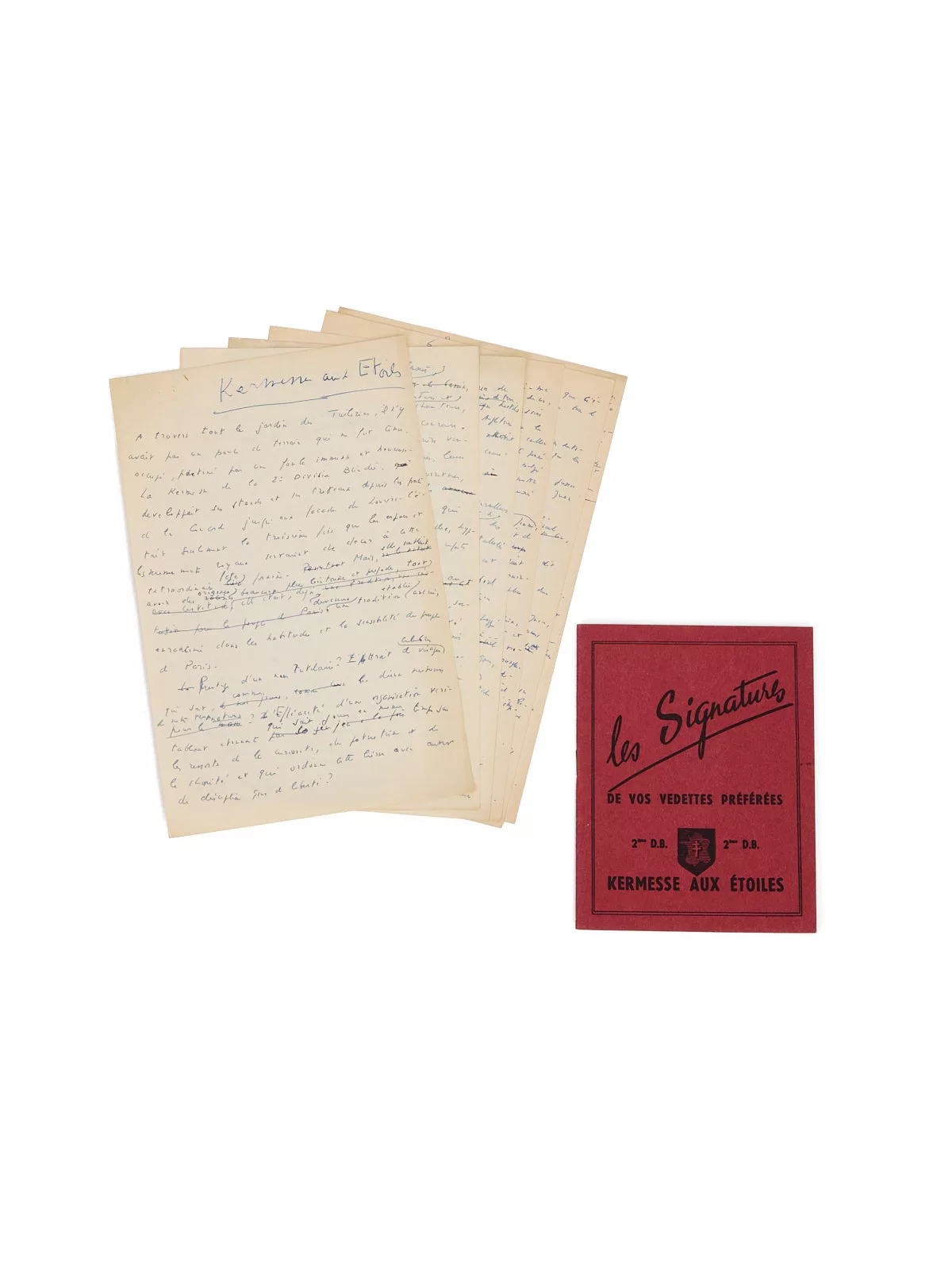 Fête parisienne la plus populaire du Paris d’après-guerre, la « Kermesse aux étoiles » réunissait les plus grandes vedettes de l’époque à la rencontre du public pour des dédicaces au milieu des manèges et attractions, au profit des oeuvres sociales de la deuxième D.B. La première édition date de 1948 et la dernière de 1954. Jean Gabin, Charles Vanel, Michel Simon, Simone Signoret, Yves Montand, Édith Piaf, Fernandel, Bourvil et Luis Mariano furent de ceux qui ne manquèrent aucune édition. Théâtres, cinémas, spectacles, espaces sportifs, manèges, jardins d’enfants, bars, buvettes, restaurants, tombola, … Tout était prévu pour la fête ! La Kermesse devait surtout son succès à la présence de nombreuses vedettes de cinéma et du spectacle, mais aussi d’écrivains : chacun pouvait alors approcher son idole et faire dédicacer le carnet que l’on avait pu se procurer à l’entrée.
