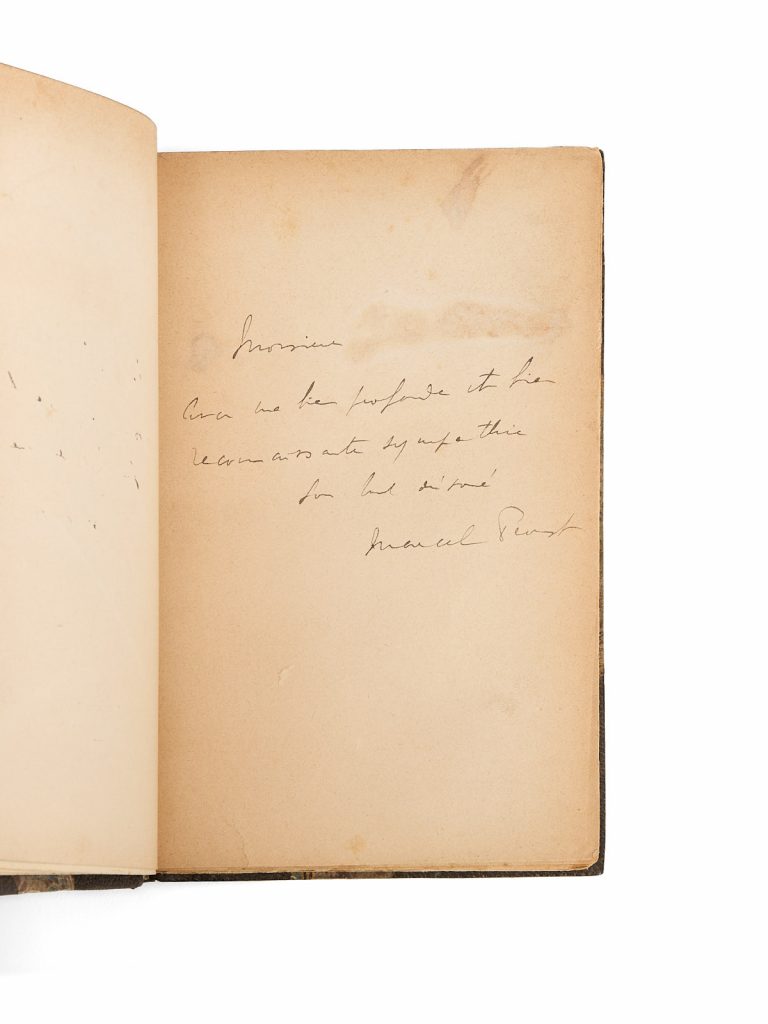 Envoi signé : « À Monsieur [nom du dédicataire tronqué], avec ma bien profonde et bien reconnaissante sympathie, son tout dévoué, Marcel Proust ».