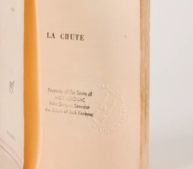 C’est probablement au cours de son seul voyage en France que Kerouac acquiert et rapporte cet exemplaire de La Chute. Gallimard avait pour habitude de lui envoyer les éditions françaises de ses exemplaires, mais rarement d’autres ouvrages dans cette langue, hormis ceux qui pouvaient lui avoir été directement adressés par des écrivains français (comme c’est le cas du Delteil, que nous présentons également).