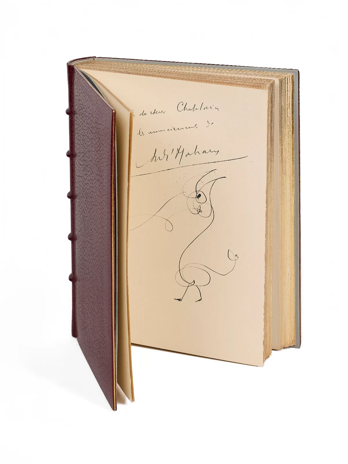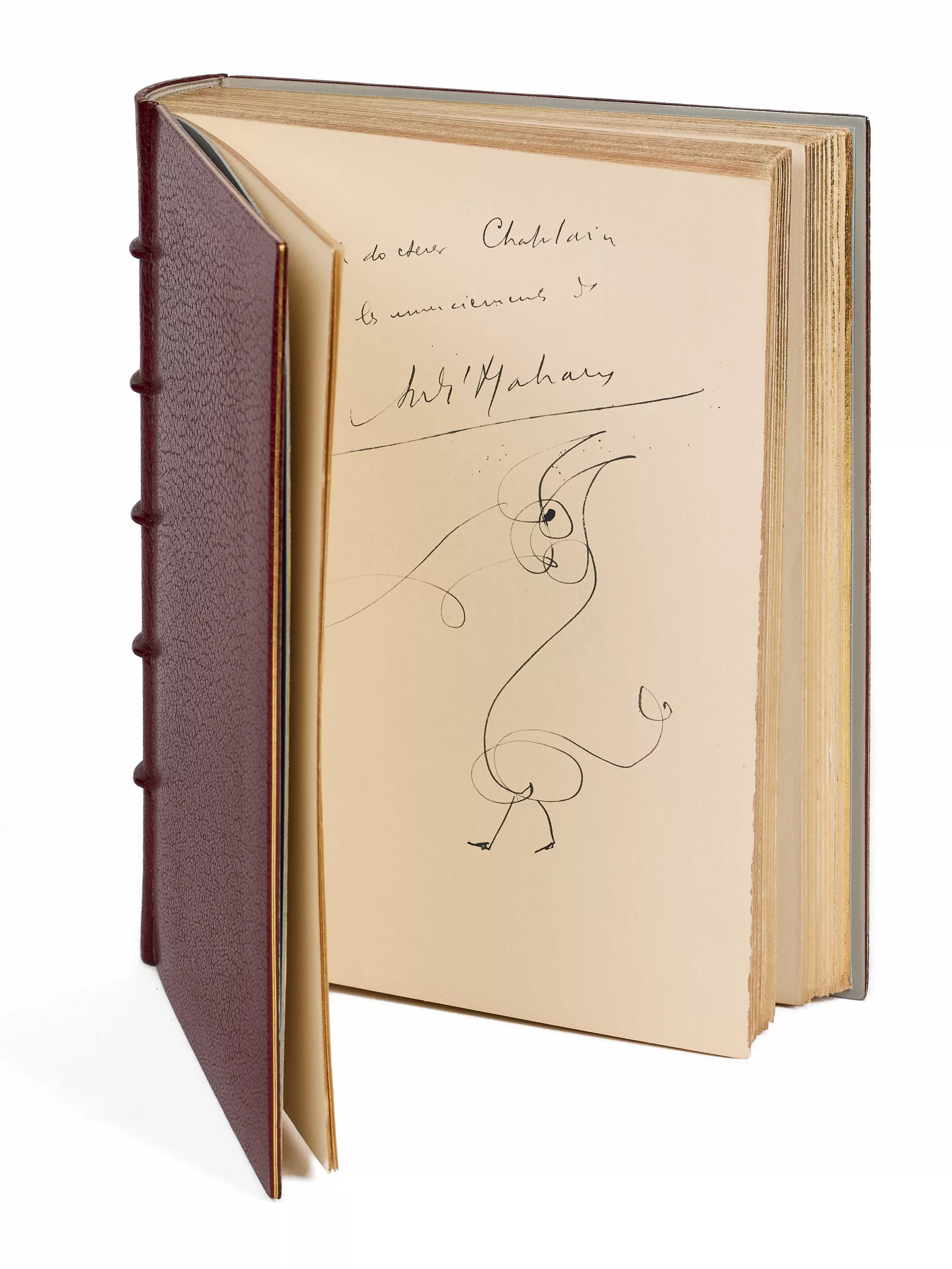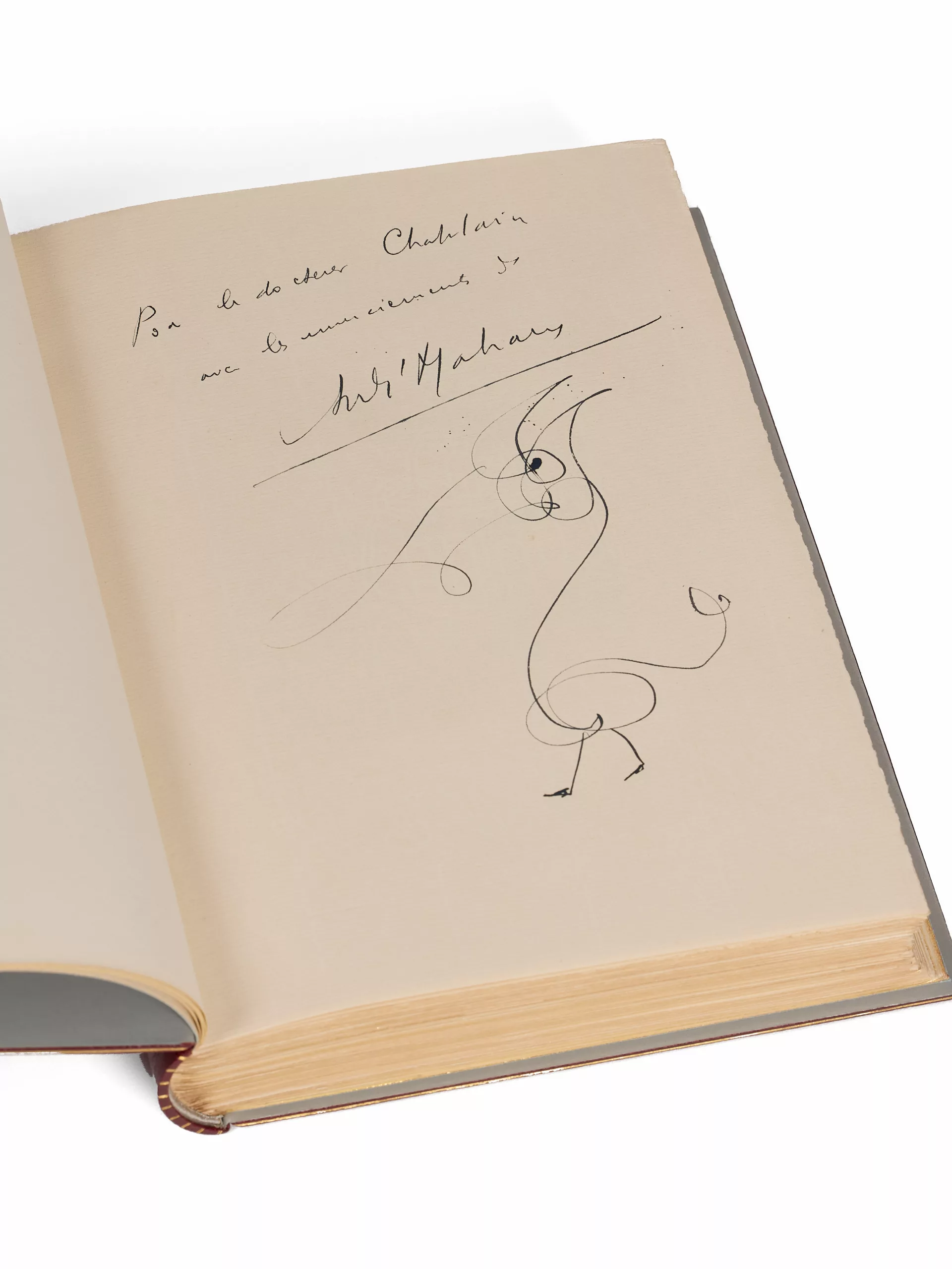 Il est enrichi d’un grand dessin fantastique dont l’auteur agrémentait souvent ses lettres et dédicaces depuis ses débuts littéraires, dès Royaume farfelu, en 1921 : il les appelait ses petits « dyables ». Dans L’Univers farfelu d’André Malraux, Marie-Josèphe Guers parle d’esquisses qui sont « davantage des arabesques que des dessins, ce qui ne les empêche pas d’être évocatrices d’une formidable force expressive. Elles peuvent, selon le moment, l’inspiration et l’élan, se rapprocher de l’idéogramme ou de la calligraphie » (p. 6-7). Ces « dyables » (l’orthographe est la sienne) étaient souvent ajoutés, en petit format, sous sa signature. Un tel format pleine page est rarissime, a fortiori sur le réimposé de son texte le plus célèbre.