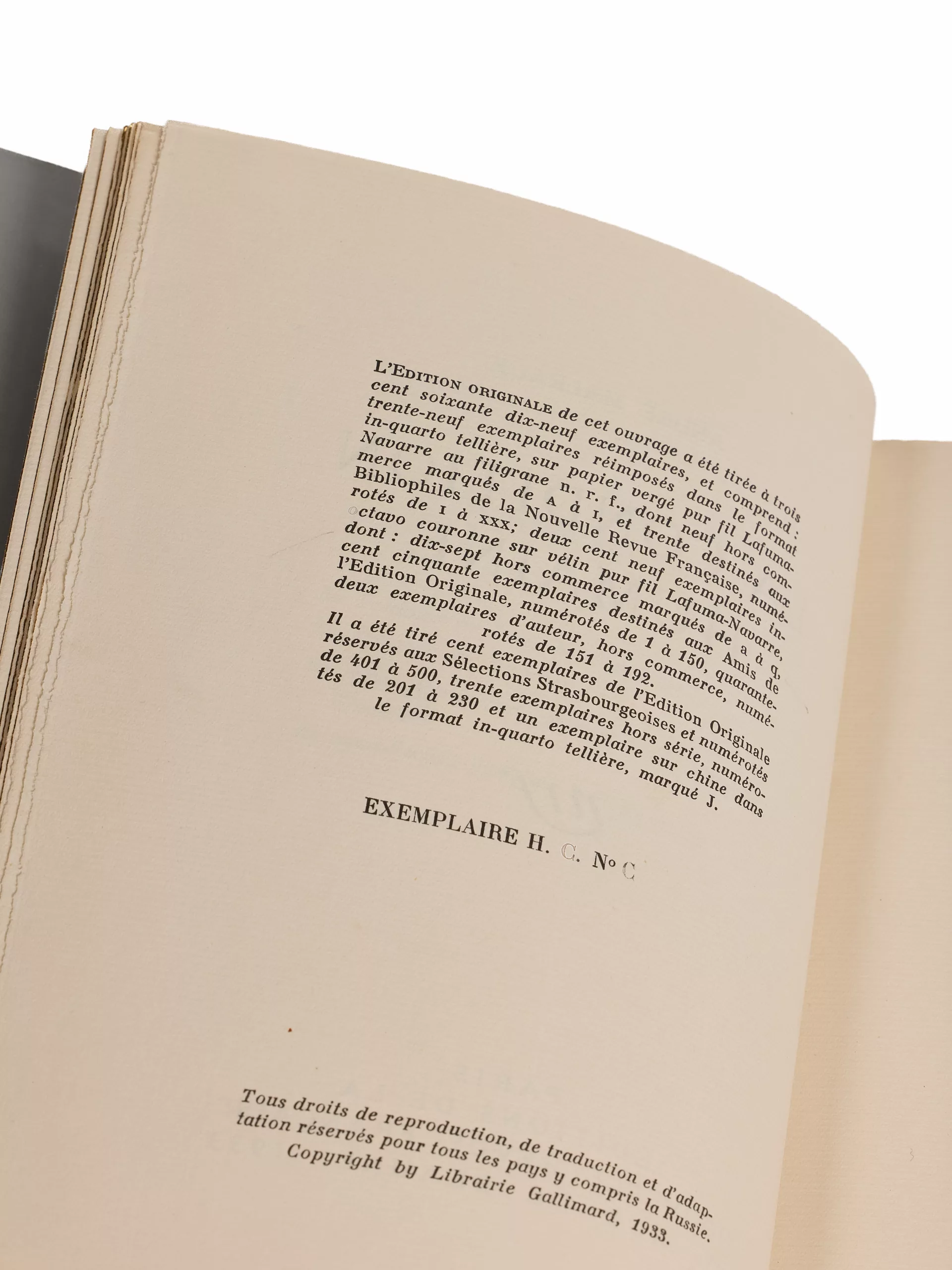 Ce dernier n’est composé que de 39 exemplaires – et un chine, d’auteur : la norme des fameux réimposés « in-quarto tellière », installée en 1919, s’achève en 1932. À partir de 1933, les réimposés vont progressivement disparaître, réservés désormais à quelques auteurs « maison », comme Martin du Gard ou Malraux, dans des tirages trois à quatre fois moins importants.