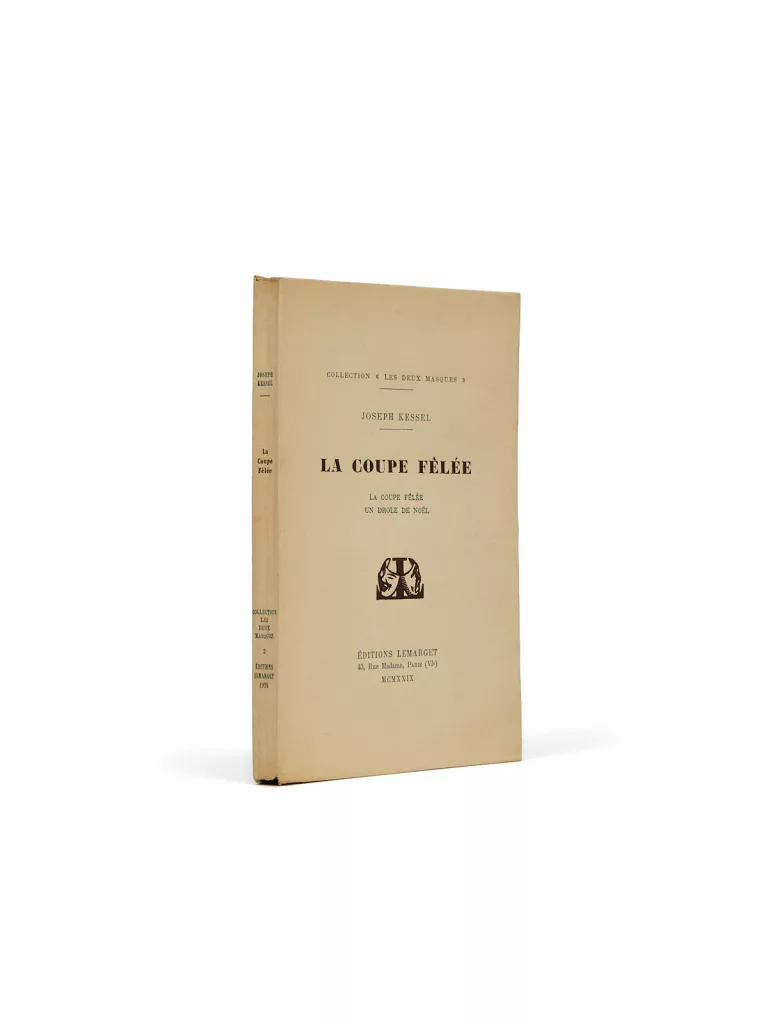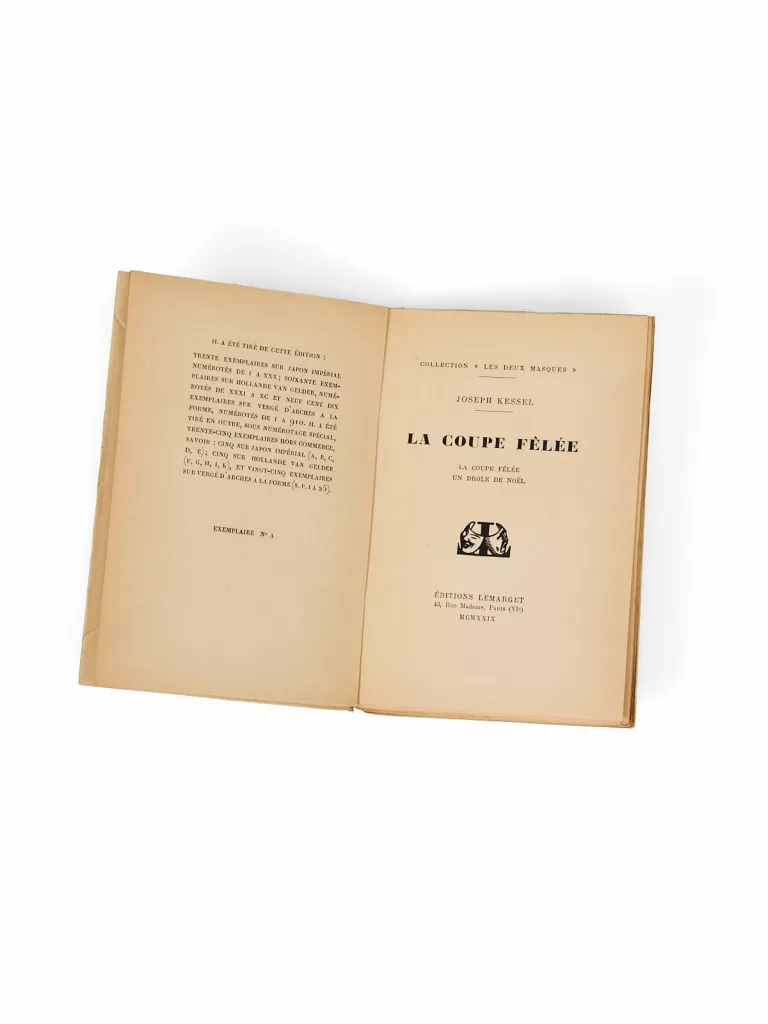 Très bel exemplaire de tête, le premier d’entre eux, exemplaire A, offert à Doris Spiegel : cette illustratrice a commencé à dessiner dans le métro new-yorkais, puis s’est inscrite à l’Art Students League of New York : elle reçoit en 1928 une bourse Guggenheim, qu’elle a utilisée pour voyager en France afin de capturer des scènes de rue puis de réaliser quelques illustrations pour des maisons d’éditions : l’un de ses premiers travaux est de réaliser le vignette de la collection « Les Deux masques », tout juste créée et dont ce titre de Kessel sera un des premiers titres. Elle reste en France pendant près de deux ans ; ses illustrations seront reprises en 1933 dans le livre Paris to the Life: A Sketch-book, dont le texte sera rédigé par Paul Morand.