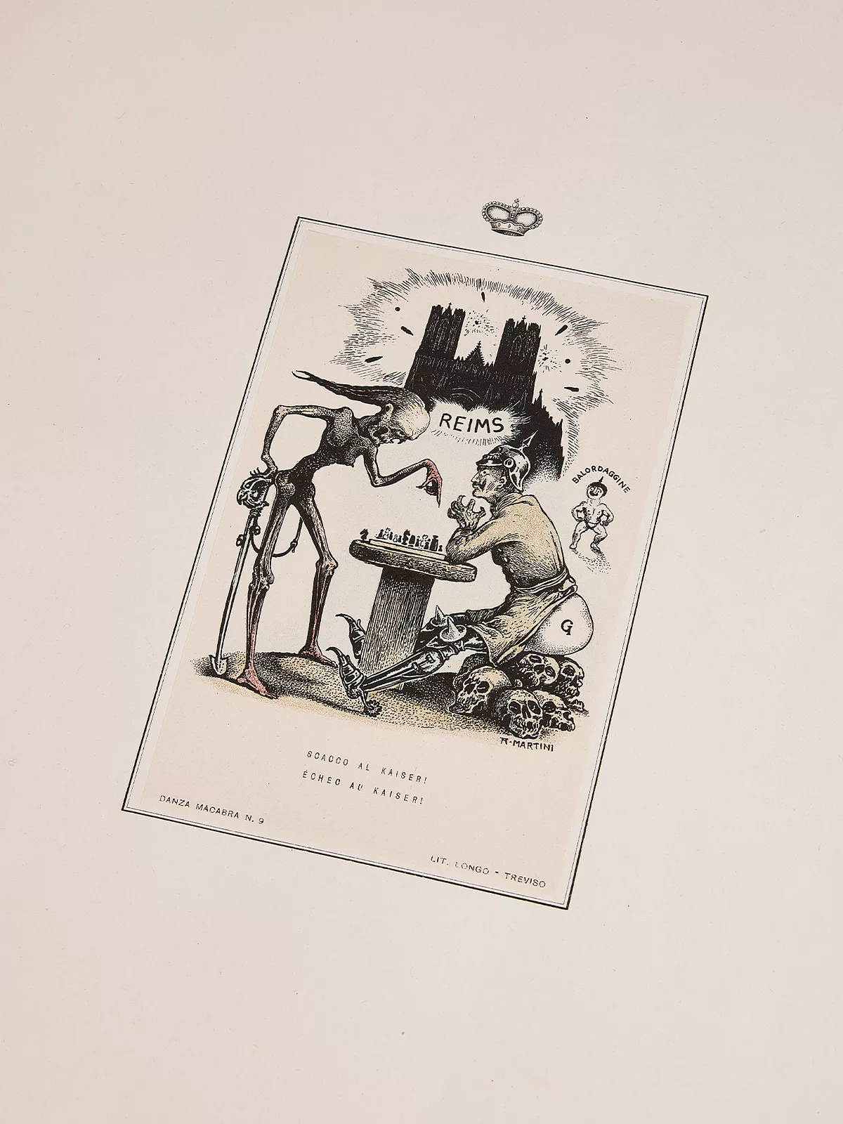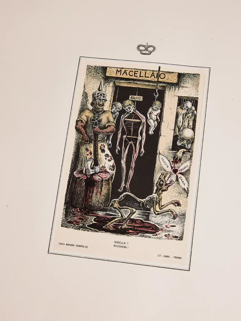 Les artistes, dans tous les pays qui ont participé au conflit, se sont attachés à glorifier leur patrie, à moquer et déshumaniser les troupes ennemies, en les représentant comme des bouchers, des violeurs aux traits difformes et grotesques. C’est dans ce contexte que Martini conçoit et réalise la série de cartes postales Danza Macabra Europea avec l’éditeur Longo de Trévise. Publié entre octobre 1914 et les premiers mois de 1916, le projet prévoyait initialement 36 lithographies à la plume qui, vu leur succès, furent divisées en 3 séries de 12 cartes postales, puis une quatrième série qui n’en comporte que 6. Les séries sont vendues sous enveloppe avec un dépliant explicatif à l’intérieur et des légendes en italien et en français au recto.