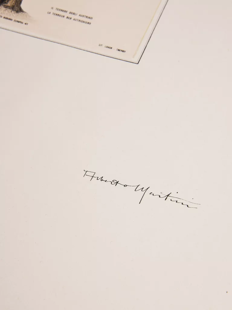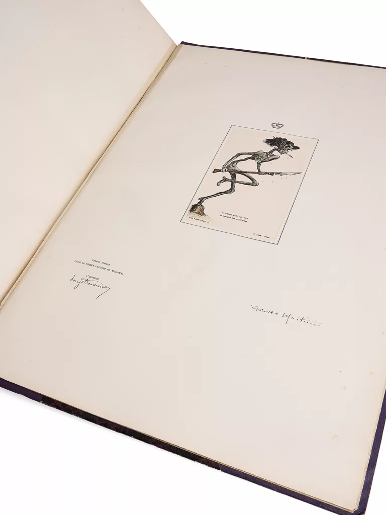 Chacune de ces lithographies, au format carte postale (140 x 90 mm), est montée dans un encadrement de filet noir, surmontée d'une couronne impériale sur une feuille de papier vélin pur chiffon filigranée « A. BINDA C. MILAN », avec la mention imprimée : « Tirage unique pour le Prince Laforge de Vitanval » ; chaque planche est signée à la plume par l'éditeur, Longo Domenico, et par l'artiste, Alberto Martini.