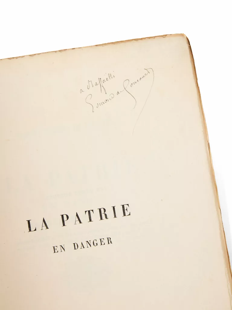 Rare exemplaire en tirage de tête, et d’intéressante provenance : Christian Galantaris a recensé, dans Les Goncourt dédicateurs onze exemplaires de La Patrie en danger avec envoi, dont cet exemplaire Raffaëlli : ce dernier est le seul dédicacé, dans l’inventaire Galantaris, qui soit imprimé sur hollande, malgré d’autres dédicataires prestigieux comme George Sand, Charles Asselineau, Victor Hugo, Charles Monselet ou Jules Claretie. Cette particularité montre toute l’estime que Goncourt portait à Raffaëlli.