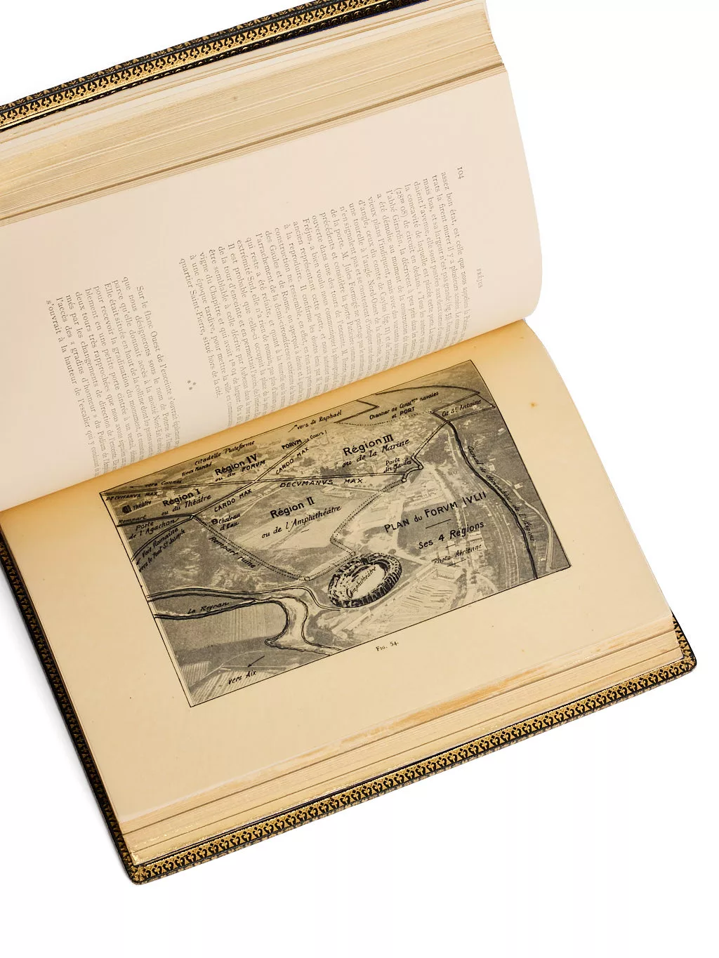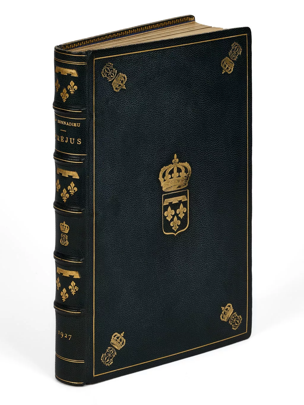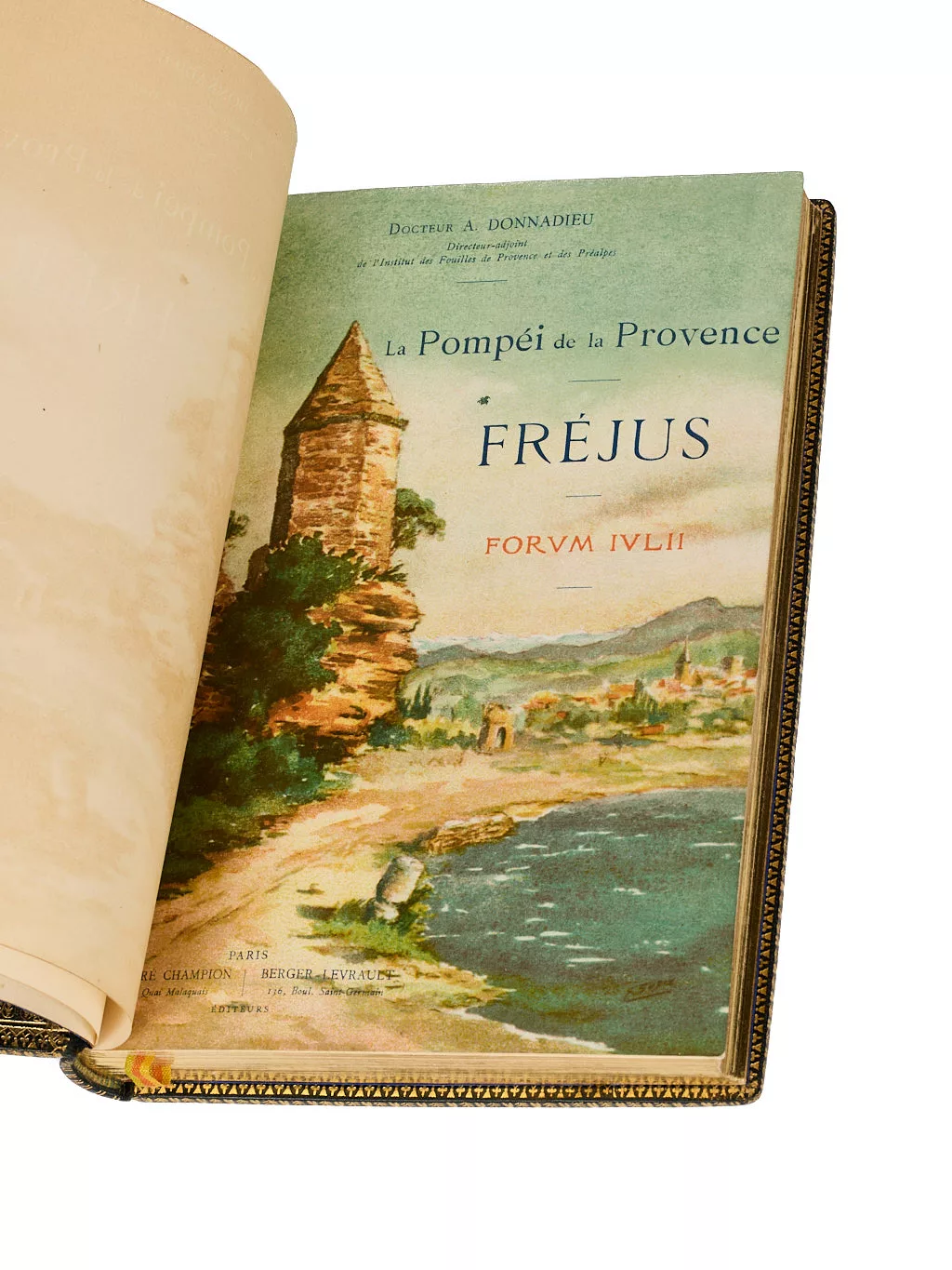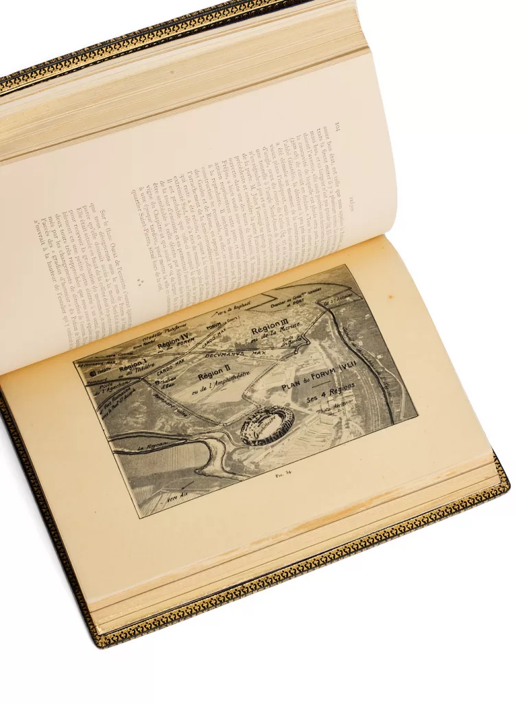 Précieux exemplaire de dédicace, aux armes d’Emmanuel d’Orléans, duc de Vendôme (1872-1931), à qui l’ouvrage est dédié, en tant que président de l’Institut des Fouilles de Provence et des Préalpes. Alphonse Donnadieu, qui s’était fait construire une villa en style pompéien qu’il appela « Mosella », (souvenir de sa Lorraine natale), fut d’abord directeur adjoint de l’Institut des Fouilles de Provence que présidait le duc de Vendôme, puis fut nommé conservateur du Musée de Fréjus et directeur des fouilles de cette ville, puis directeur des Antiquités celtiques, grecques et gallo-romaines de l’arrondissement de Fréjus. Quelques temps maire de Fréjus, c’est par ses soins que le Musée de la ville, presque inaccessible naguère, devint une des meilleures collections antiques de la France.