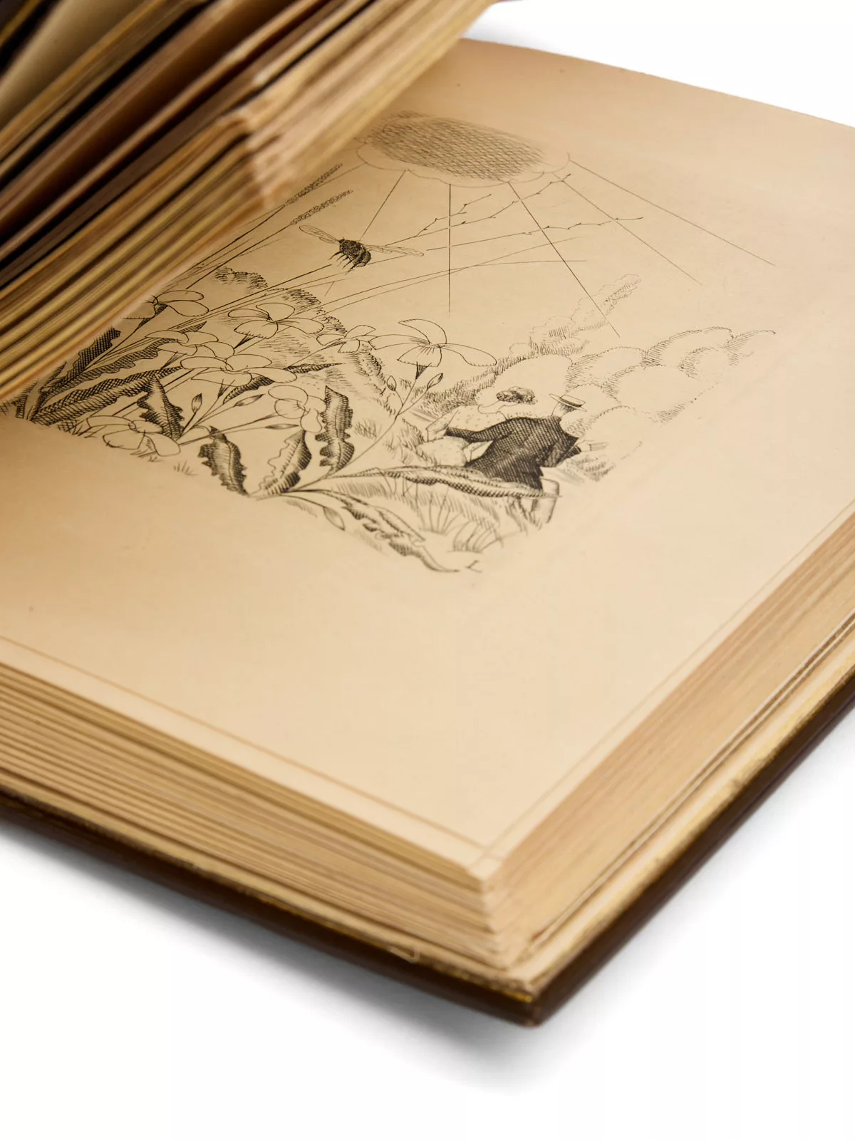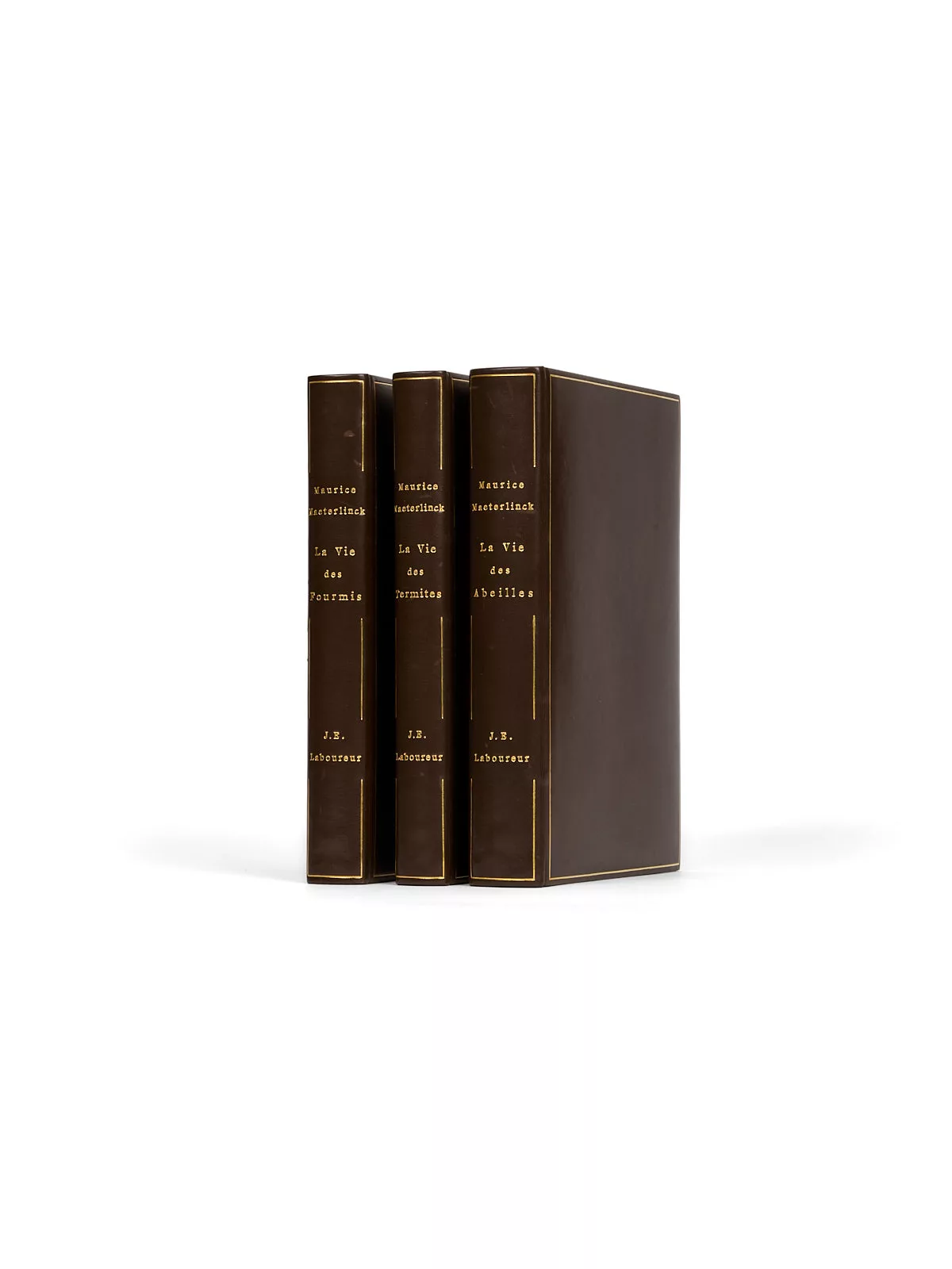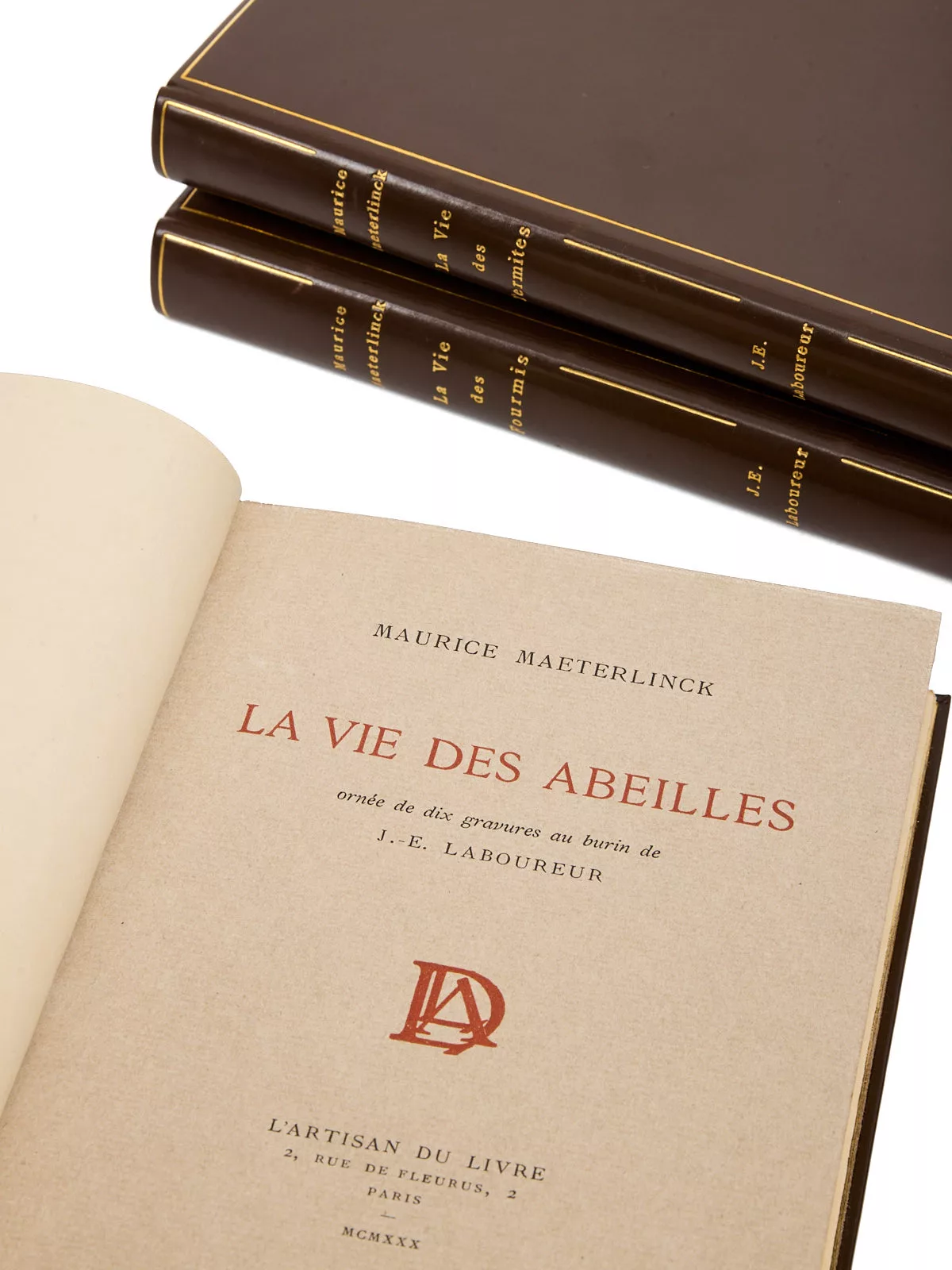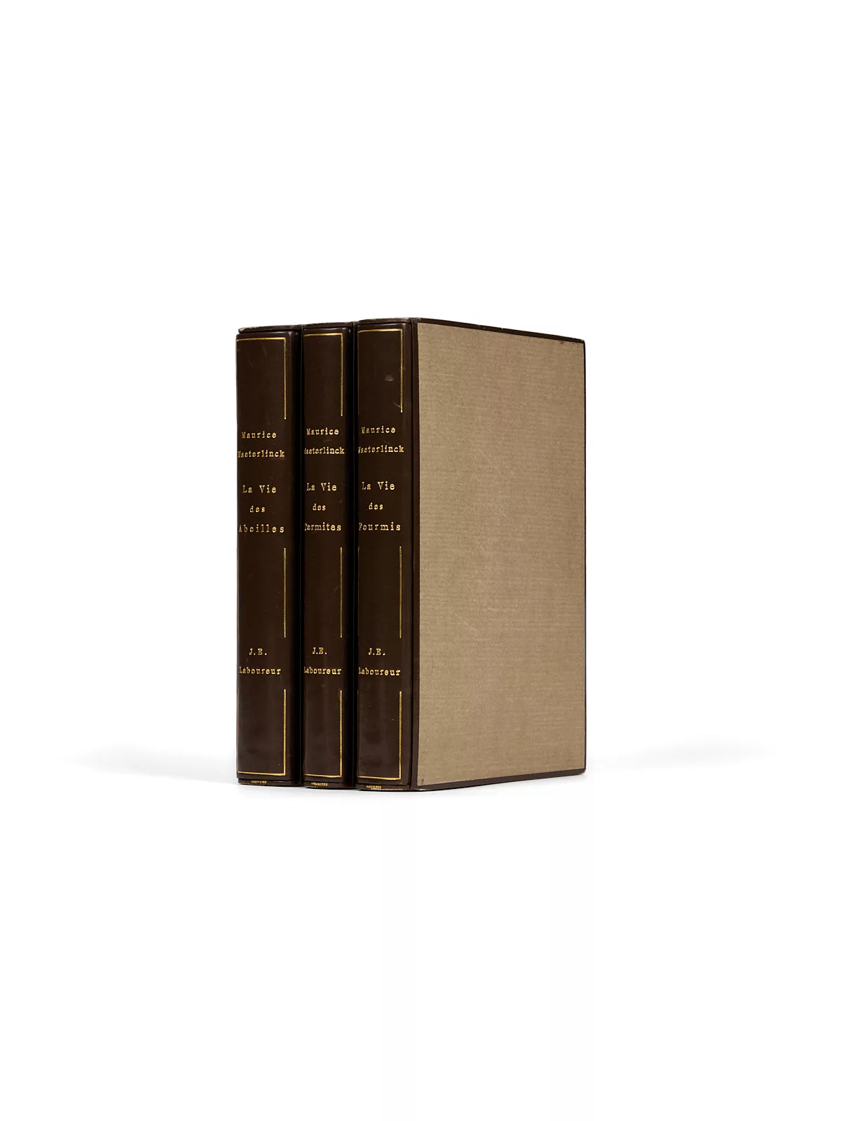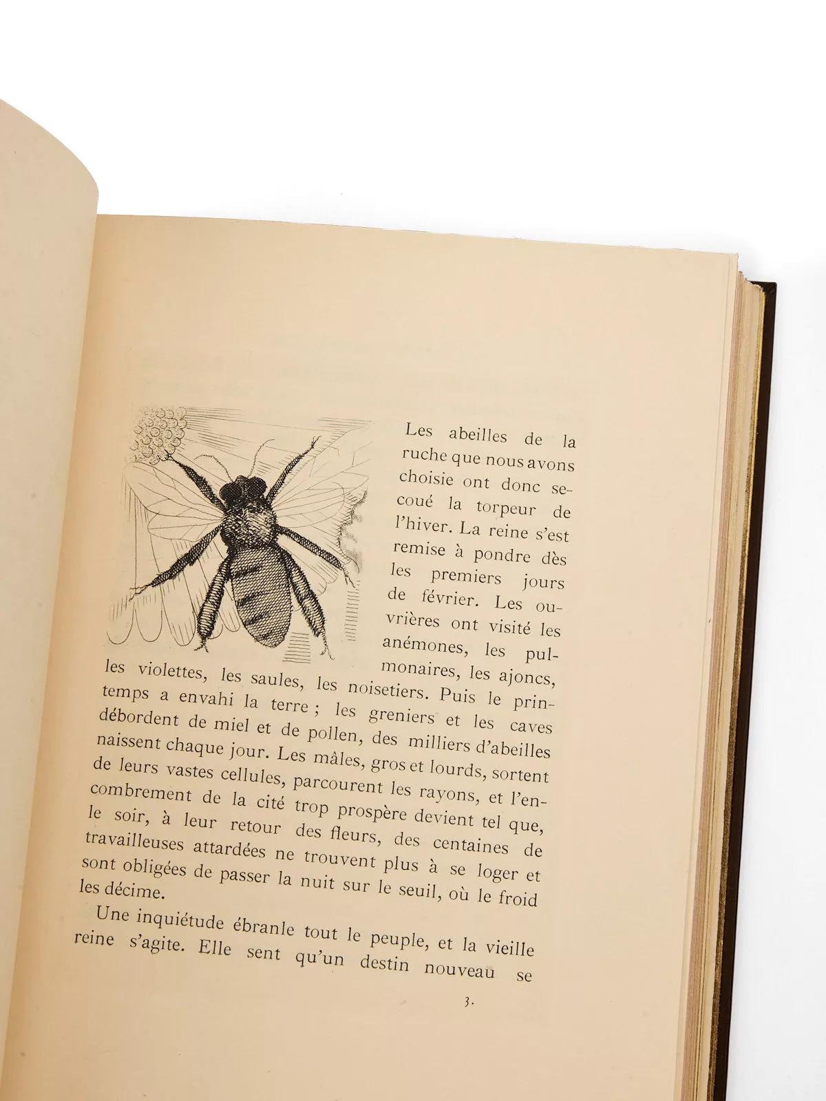 Magnifique exemplaire de cet ovni littéraire, dans lequel on découvre – avec ravissement -, au premier tome, la vie intime de l’apis mellifica, communément nommée « abeille » et de son essaim, depuis qu’il a quitté la ruche chaude et confortable pour affronter un monde plein de périls, Maeterlinck évoquant « une étrange petite république, si logique et si grave, si positive, si minutieuse, si économe, et cependant victime d’un rêve si vaste et si précaire ».