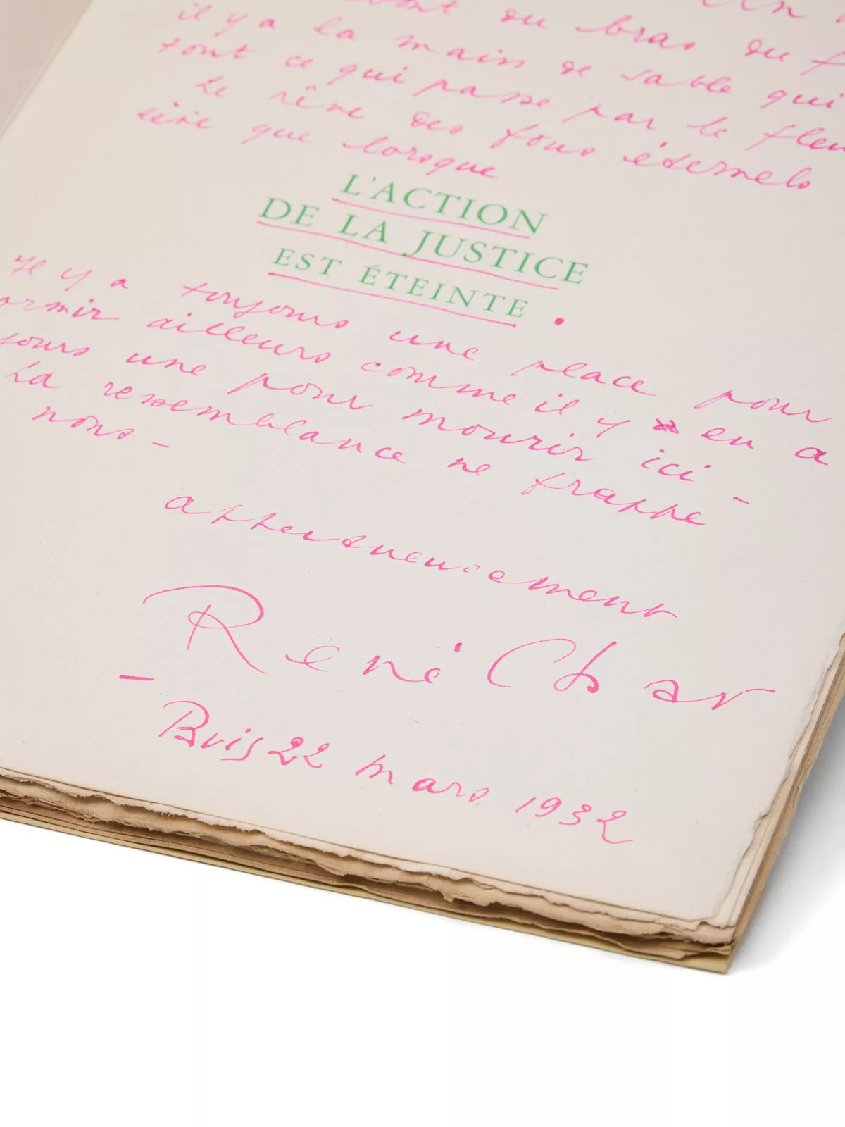 Envoi signé à l'encre rose : « à Pierre Unik, ‘au bout du bras du fleuve il y a la main de sable qui écrit tout ce qui passe par le fleuve’. Le rêve des fous éternels ne se lève que lorsque [L'action de la justice est éteinte]. Il y a toujours une place pour dormir ailleurs comme il y en a toujours une pour mourir ici. La ressemblance ne frappe que nous. Affectueusement, René Char. Buis, 22 mars 1932 ».