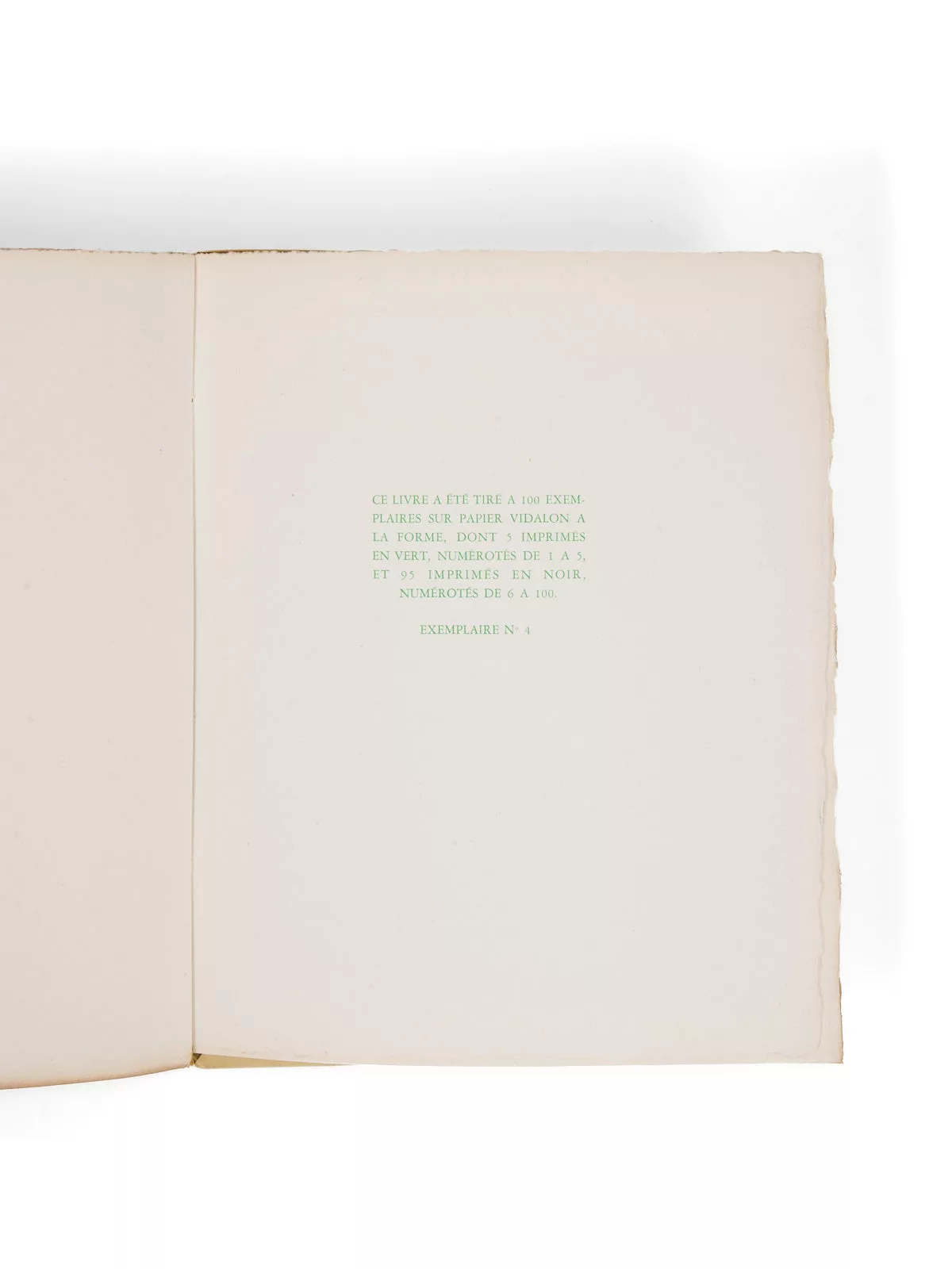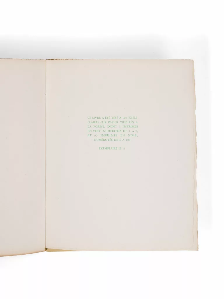 Un des 5 premiers exemplaires imprimés en vert, sur papier Vidalon à la forme (n° 4).