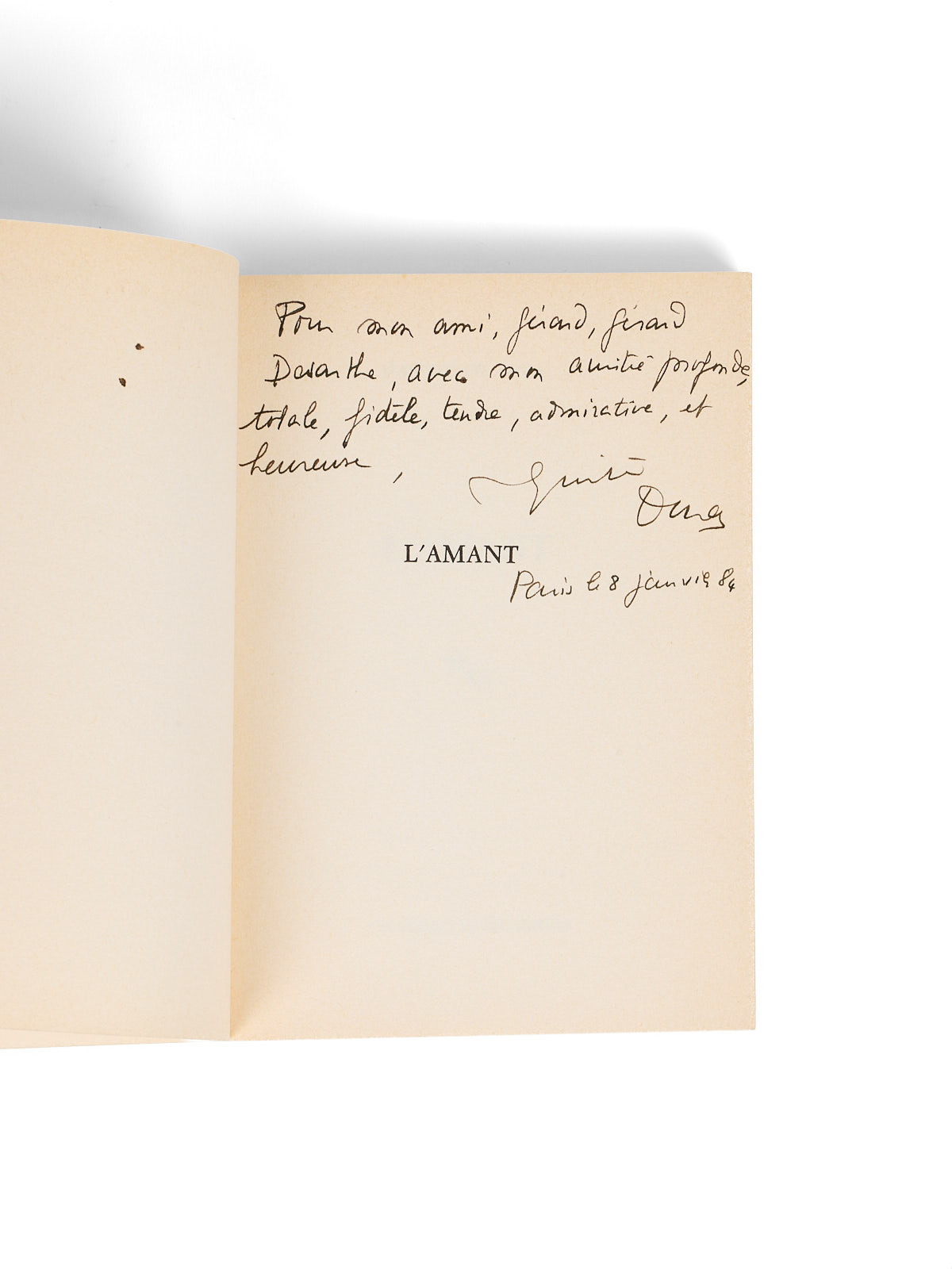 Très bel exemplaire offert à Gérard Desarthe. Ce dernier avait, en cette année 1984, porté au théâtre, seul sur les planches, Aurélia Steiner, au théâtre du Rond-Point, mis en scène par Duras elle-même. Desarthe avait, en 1971, connut un de ses premiers rôles au cinéma dans Jaune le soleil, le troisième film de Marguerite Duras, adapté de son roman Abahn Sabana David. Le début d’une longue et grande carrière de comédien, qui culmina avec ses rôles dans Peer Gynt et Hamlet mis en scène par Patrice Chéreau à la fin des années 80.