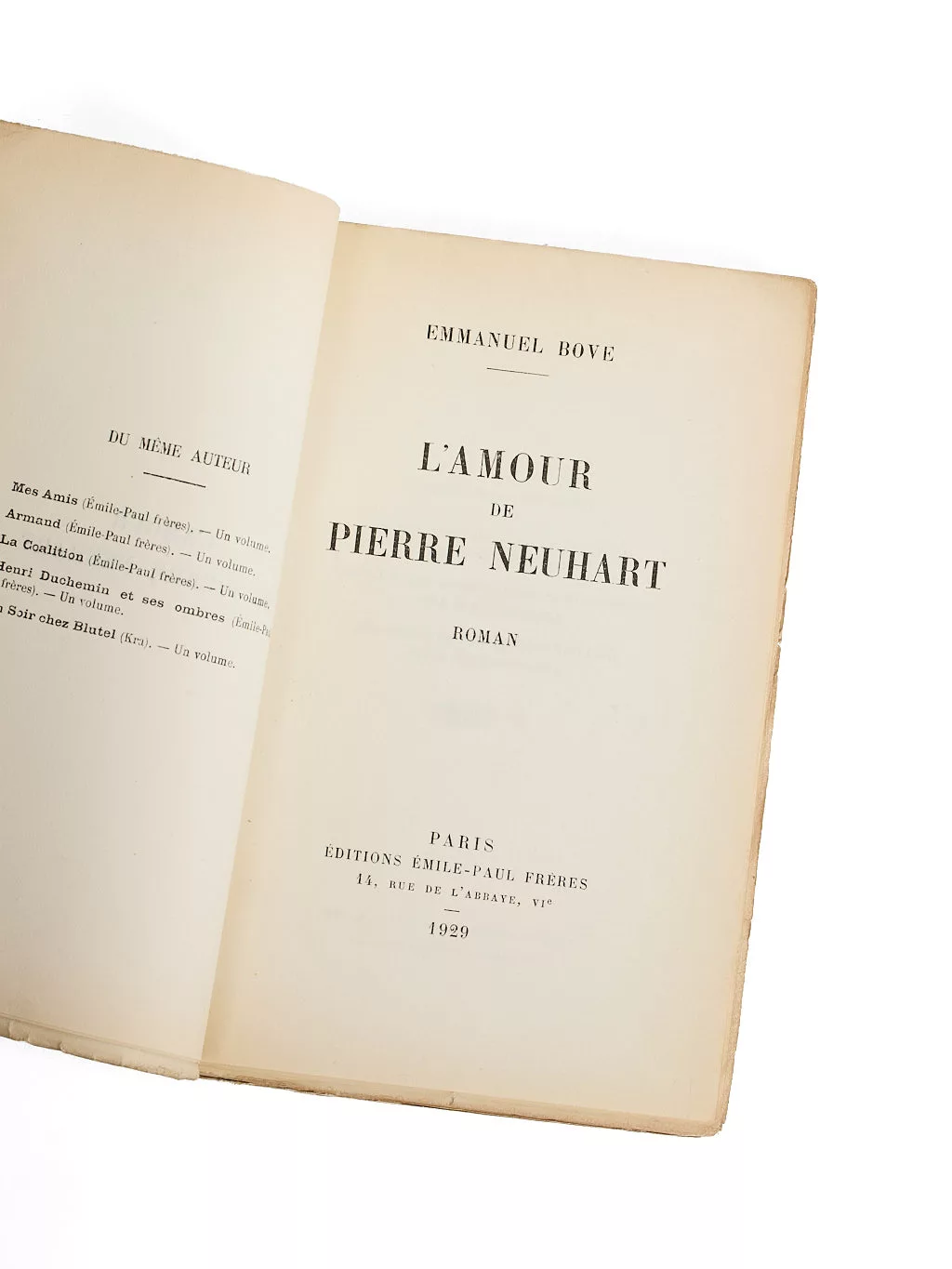 Roman de la première manière de Bove, dans ces années où, après Mes amis (1924) et Bécon-les-Bruyères (1927), il son écriture, sobre et coupante. L’Amour de Pierre Neuhart suit, au quotidien, un homme qui s’efforce de comprendre ce qu’aimer veut dire et se heurte à sa propre gaucherie, composant un « réalisme du désarroi » que Simenon et Modiano, notamment, salueront.