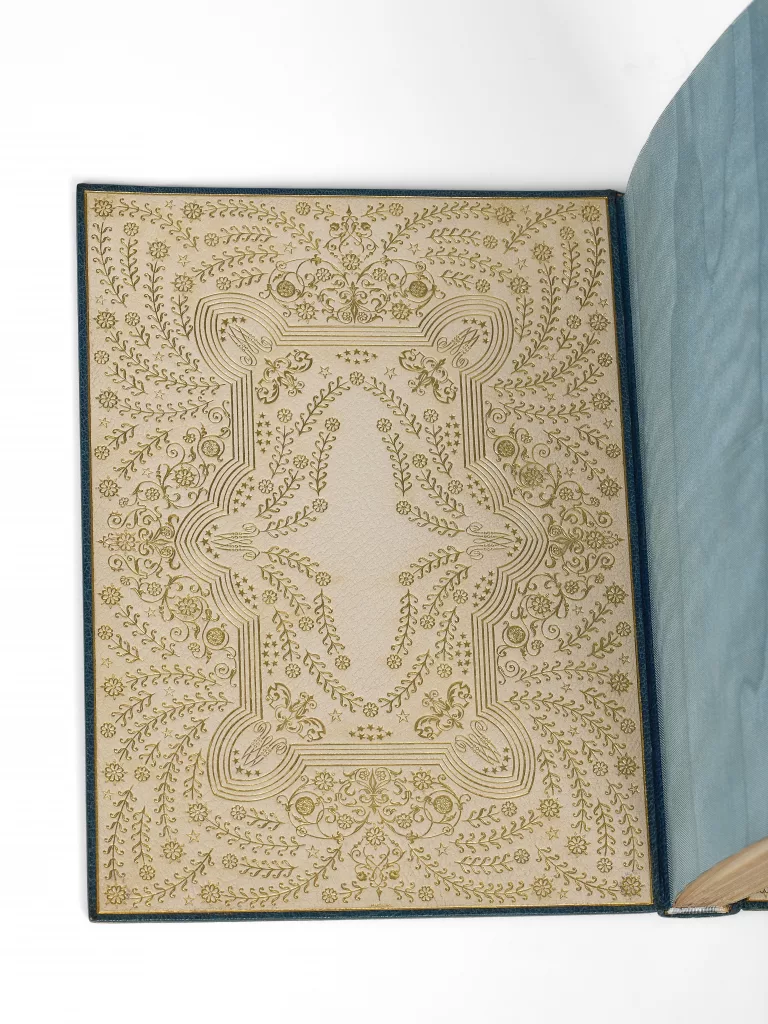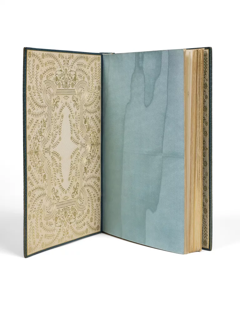 Passé dans la bibliothèque de Raoul Simonson, cet exemplaire a été précieusement établi dans le pur style « janséniste » où le décor n’apparaît qu’une fois le livre ouvert. Les contreplats de maroquin ivoire richement ornés comportent le chiffre « MM » répétés aux quatre angles.