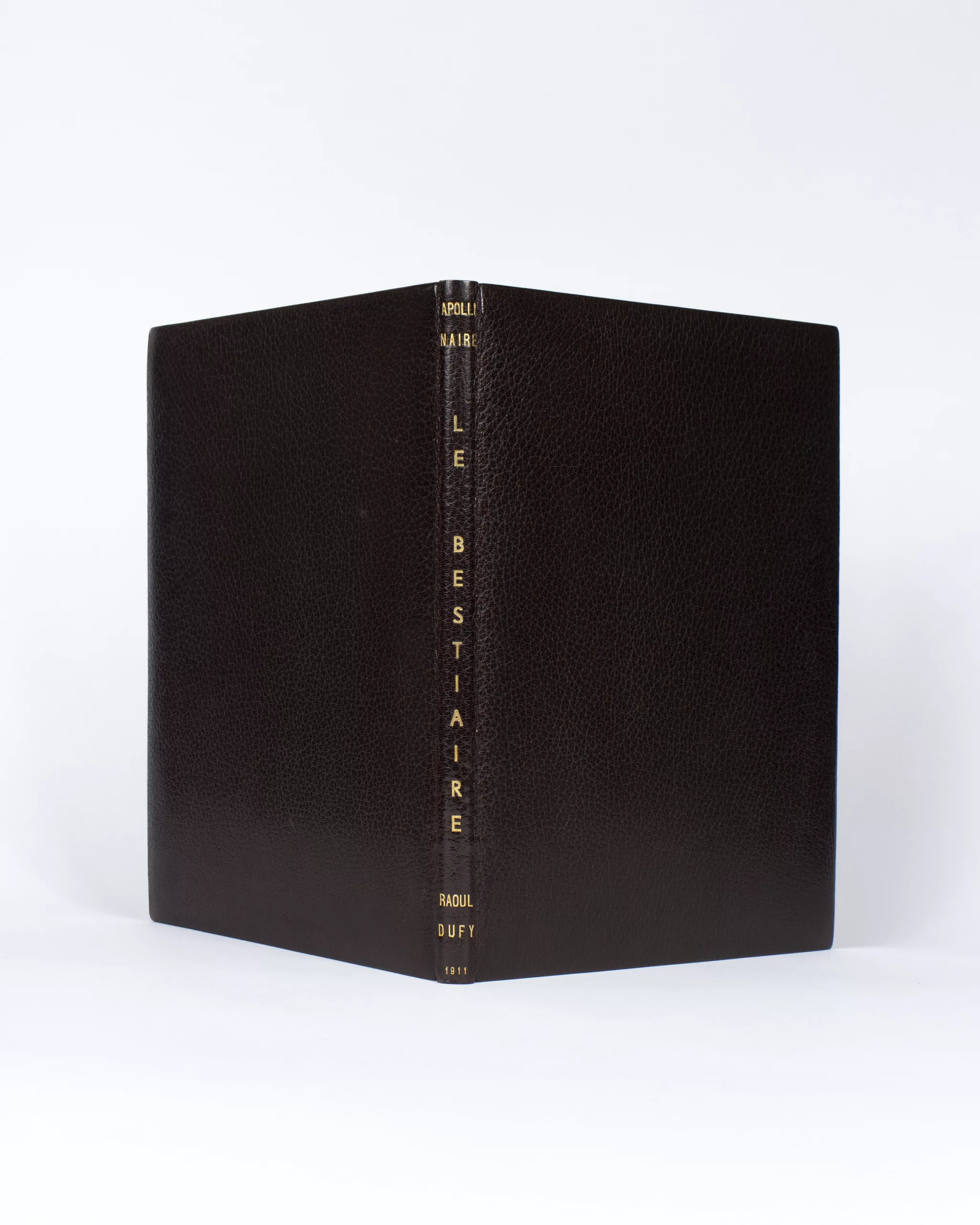 Ce recueil de poèmes sur les animaux est le premier livre illustré par Dufy, qui livre 39 bois originaux, dont 4 à pleine page, 26 à trois-quarts de page, 4 vignettes et 5 lettrines. Apollinaire avait initialement pensé confier à Picasso ces trente poèmes, dont quinze avaient été publiés en juin 1908 dans La Phalange, mais c’est finalement vers Dufy qu’il se tourne, « certain qu’avec votre art que vous possédez bien et votre culture un idéal vous transportera et que le résultat de votre travail sera merveilleux », lui écrit-il en août 1910, avec la liste des poèmes. Le Bestiaire « reste un des témoignages les plus originaux de la résurrection du livre illustré telle que la voulurent les poètes. On sait que l’oeuvre d’Apollinaire inspira plus tard Chirico, Marcoussis et encore Dufy mais ces rencontres posthumes n’appartiennent plus à ces temps héroïques où deux jeunesses se soutiennent mutuellement » (Fr. Chapon). Le tirage est limité à 120 exemplaires.