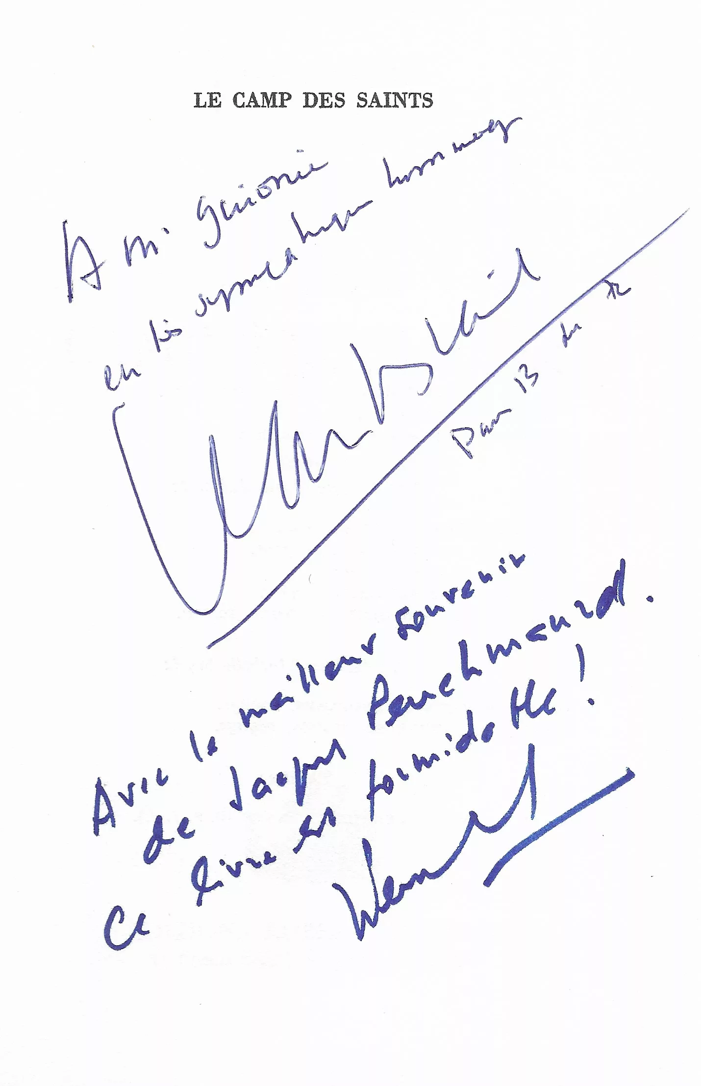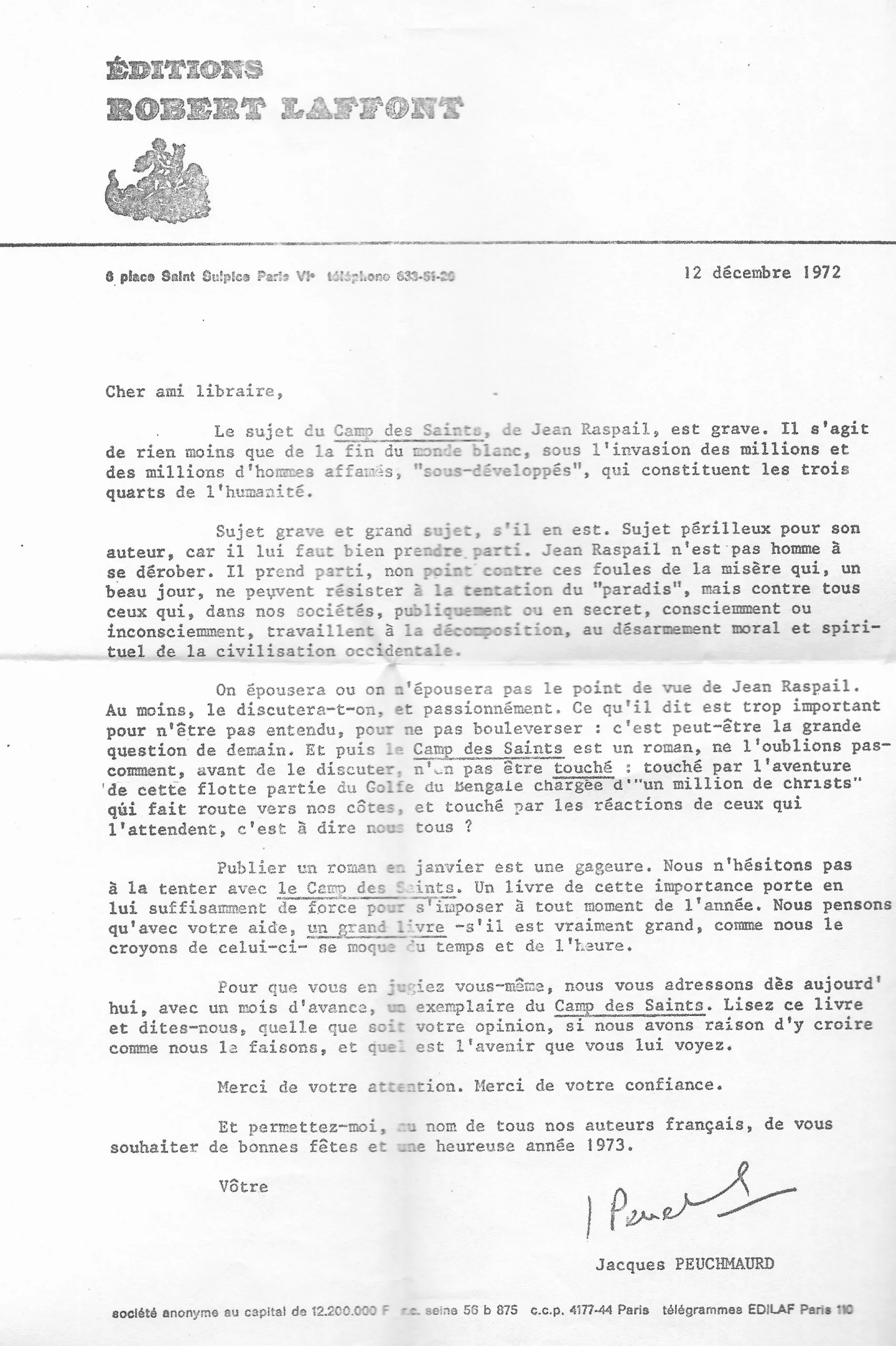 Édition originale.Envoi signé : « à M. Guionie, en très sympathique hommage, Jean Raspail, Paris, 13 déc. 72 » ; " Avec le meilleur souvenir de Jacques Peuchmaurd. Ce livre est formidable ! ". Double-envoi de l'écrivain et de son éditeur, des plus précoces : la date est celle du lendemain de l'achevé d'imprimer du volume en premier tirage (12 décembre) ; c'est aussi la date du courrier envoyé aux libraires afin de promouvoir l'ouvrage, ici joint : "Le Camp des saints. Sujet grave et grand sujet, si il en est (…) On épousera ou on épousera pas le point de vue de Jean Raspail. Au moins le discutera-t-on, et passionnément. Ce qu'il dit est trop important pour ne pas être entendu, pour ne pas bouleverser (…) Pour que vous jugiez vous-même, nous vous adressons dès aujourd'hui, avec un mois d'avance, un exemplaire du Camp des Saints. Lisez ce livre et dites-nous, quelle que soit votre opinion, si nous avons raison d'y croire comme nous le faisons ". Le courrier est signé Jacques Peuchmaurd, directeur littéraire chez Robert Laffont. Il sera quelques mois plus tard le fondateur et l'animateur de l'École de Brive, créé cette même année 1973 lors de la première édition du Festival du livre de Brive-la-Gaillarde - dont il est un des ardent promoteur -, avec Claude Michelet, Denis Tillinac et Christian Signol.Et comme l'histoire aime être ronde, l'exemplaire est justement offert à l'un des libraires les plus emblématiques d'alors de cité corrézienne : à Jean Guionie, qui tenait la éponyme dans la rue de l'Hôtel-de-ville.