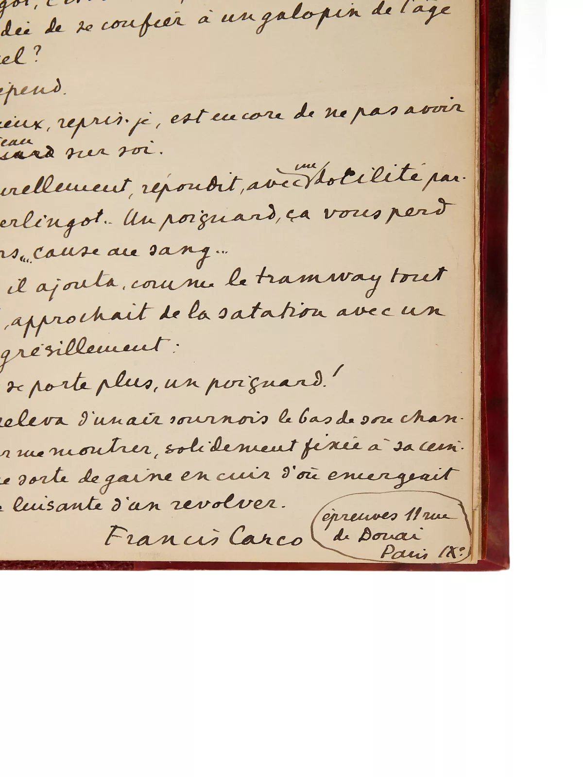 Envoi signé : « pour Florence Jay Gould, ce couteau dans le coeur, Fr. Carco », avec un autoportrait à la plume, signé par Carco.