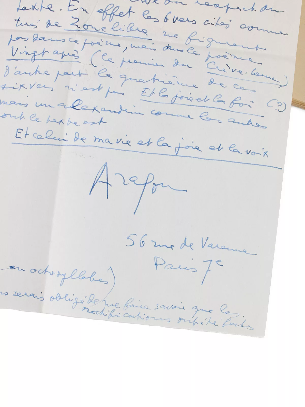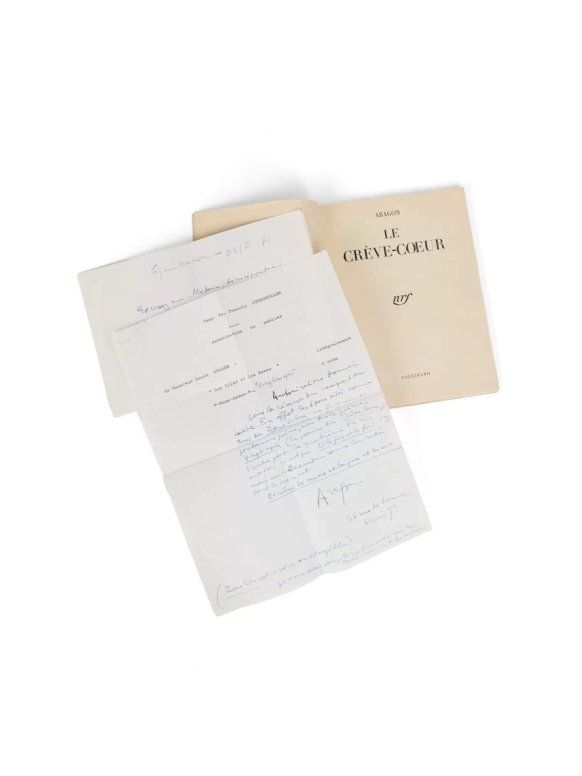 Les deux lettres autographes d’Aragon autorisent la publication de deux poèmes de ce recueil, « Les Lilas et les Roses » et « [Zone libre] – Vingt ans après », avec quelques correctifs donnés par Aragon : « autorisations données sous la réserve du respect du texte, En effet, les 6 Vers cités comme tirés de « Zone libre » ne figurent pas dans ce poème, mais dans le poème « Vingt ans après » – le premier du Crève-coeur (…) « .