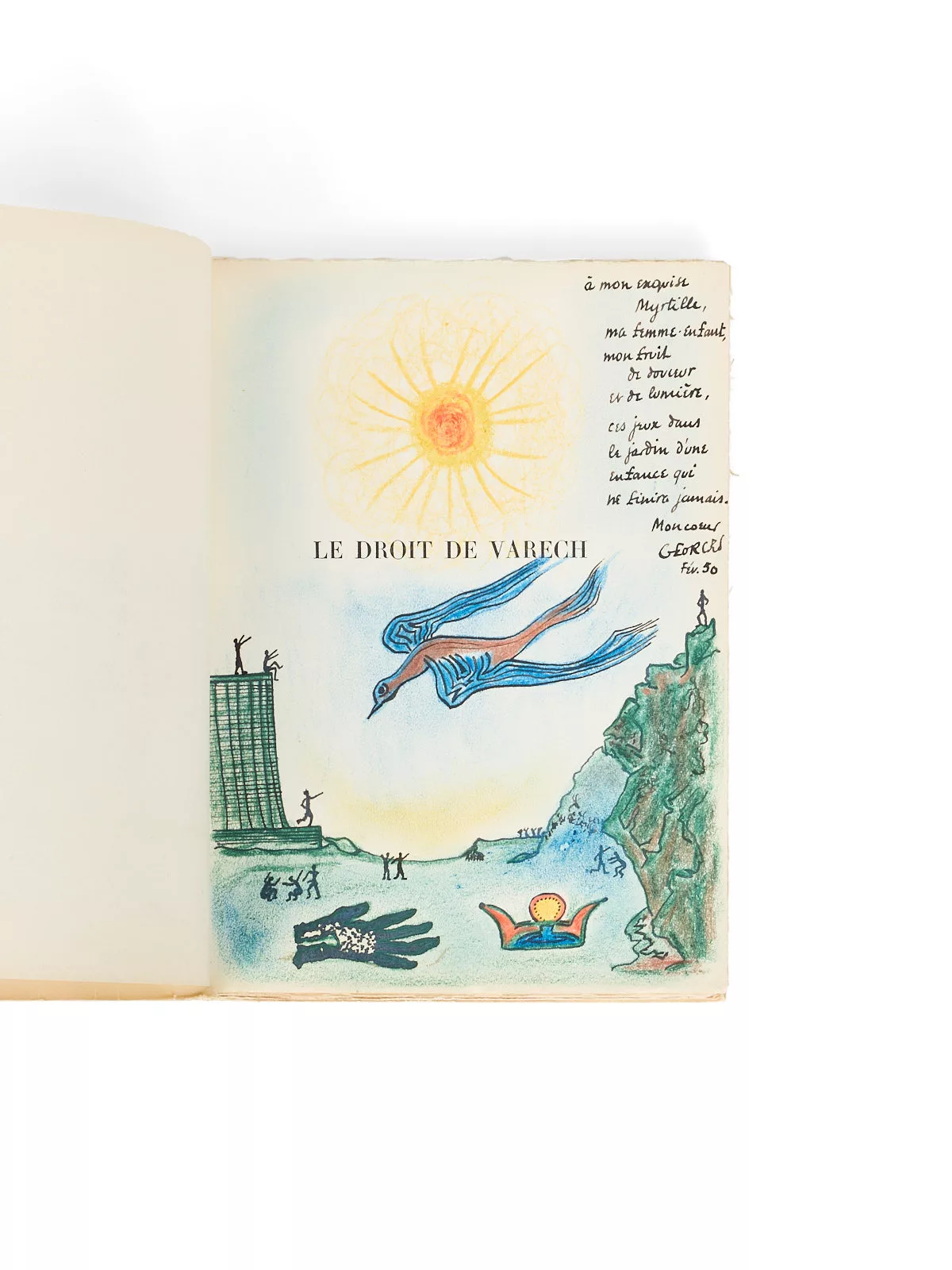S’il est des personnages « politiques » dans le théâtre surréaliste, la figure du tyran est assurément l’une des plus usitées. Si le Père Ubu, réactualisé par Max Ernst en 1937, est la figure emblématique, d’autres l’avaient utilisée avant lui : Ribemont-Dessaignes dès 1916 dans L’Empereur de Chine ; Ivan Goll dans Mathusalem en 1923. Hugnet en donne ici, en 1930, sa version dans Le Droit de Varech, « en rapport avec le projet de l’utopie de la prospérité sociale basée sur le pouvoir magique (…) d’un mécanisme merveilleux qui attire les navires vers un île pour en constituer la richesse » (Surréalisme et politique, p. 102). Qu’il offre ici cet exemplaire à sa jeune future épouse est assez symbolique : le mécanisme du merveilleux en question, telle la sirène attirant les marins, se révèlera être dans Le Droit de Varech… une femme.