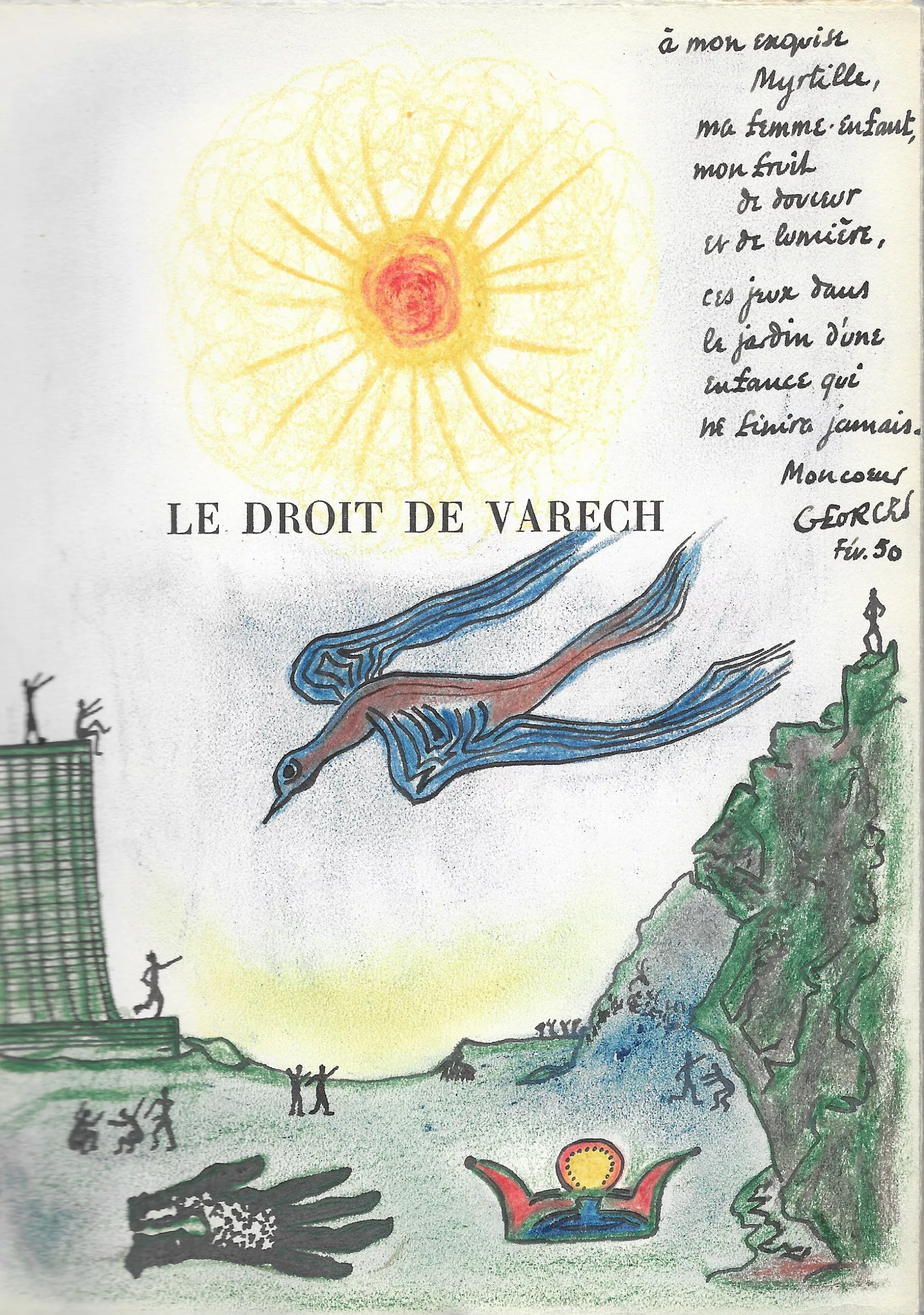 La jeune Myrtille Hubert à qui Hugnet adresse cet exemplaire n’a que dix-sept ans et deviendra sa femme deux mois plus tard. L’envoi est accompagné d’un très grand dessin original de l’auteur, d’inspiration surréaliste, à l’encre et aux crayons de couleur et couvrant tout le faux-titre.