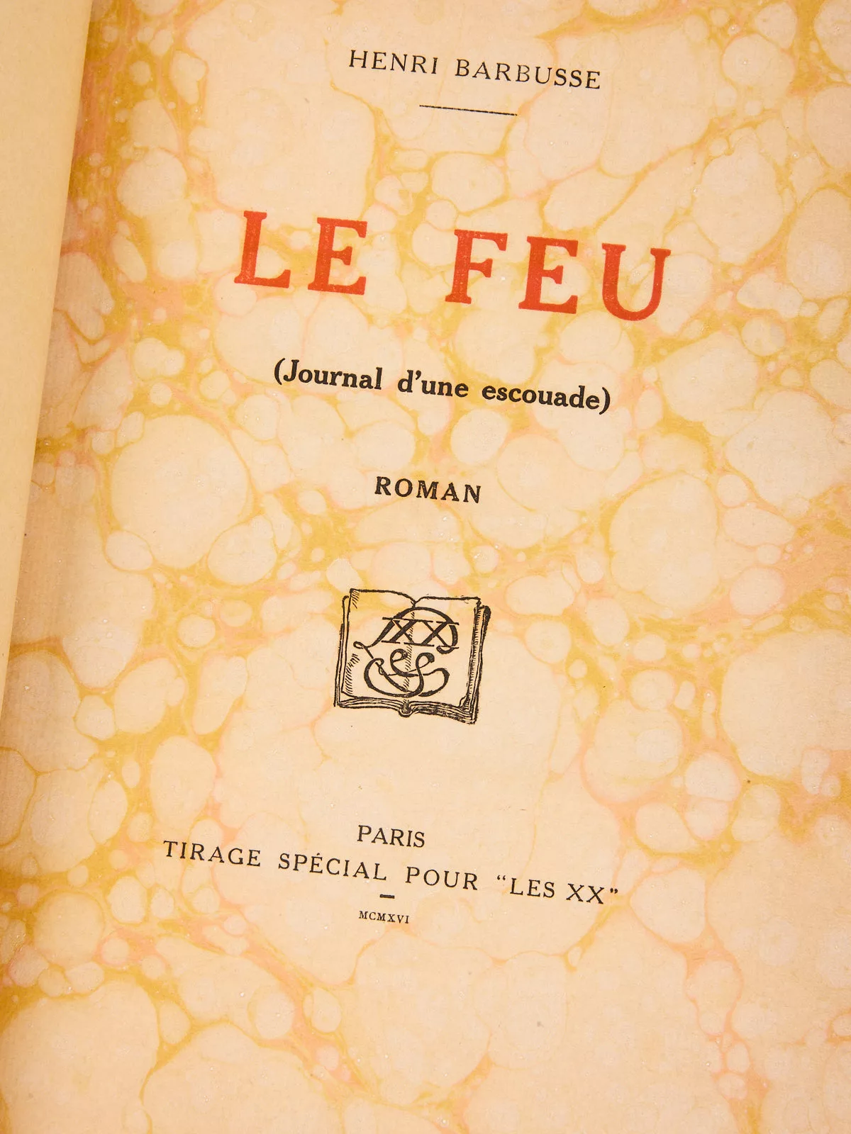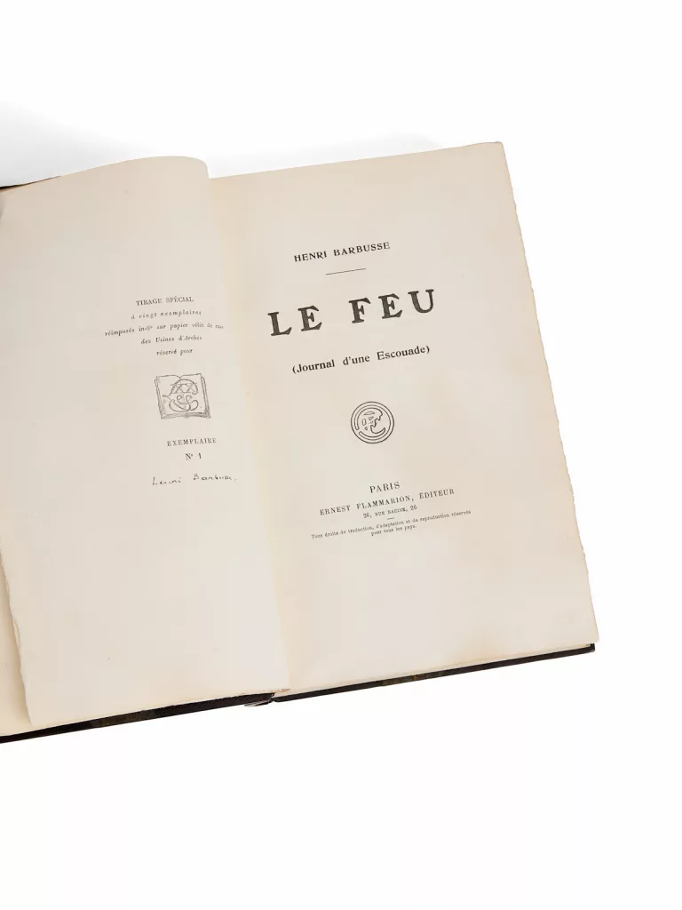 Le présent exemplaire appartient au rare tirage des XX, limité à 20 exemplaires hors commerce, tous signés par l’auteur. Il s’agit du n° 1, réservé à Henri Lenseigne, président de la Société des XX. Une lettre autographe en tête, signée de Barbusse, permet de documenter précisément la publication : ce tirage est postérieur à l’édition originale, et ce n’est qu’en octobre 1917 que Barbusse accepte de signer les feuillets justifiés. L’enveloppe d’envoi conservée, oblitérée à cette date, le confirme.