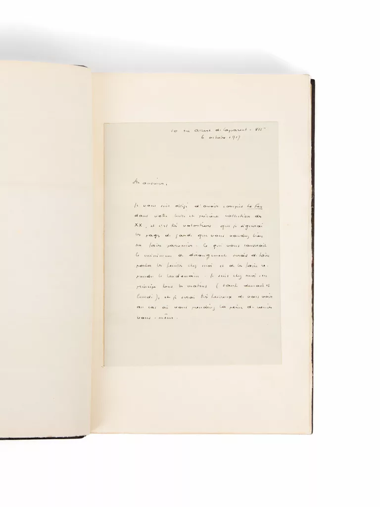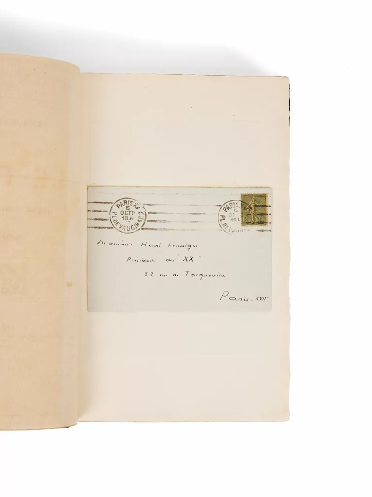 Montée en tête : lettre autographe signée, adressée au président de la Société des XX, datée du 6 octobre 1917 « […] je vous suis très obligé d'avoir compris Le Feu dans votre belle et précieuse collection des XX, et c'est très volontiers que je signerai les pages de gardes que vous voudrez bien me faire parvenir… ».