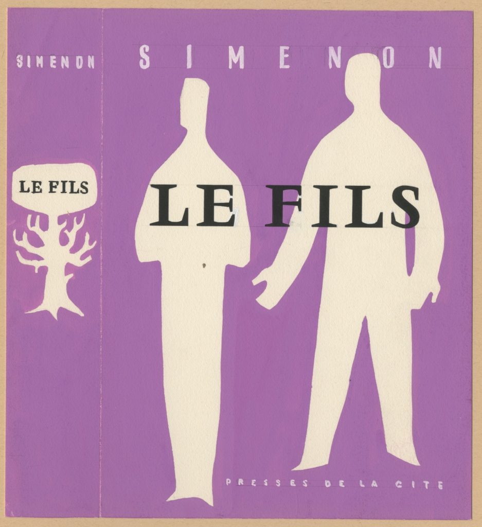 Pour Le Fils, ce sont d’abord trois maquettes qui seront proposées à Simenon. L’illustration finale sera proche de la dernière, à laquelle Jacquelin superposera des couleurs plus vives qui seront par la suite réutilisées. La jaquette sera la première de la série des 26 qui suivront, jusqu’en 1962, pour des éditions originales ou des rééditions de titres déjà parus.