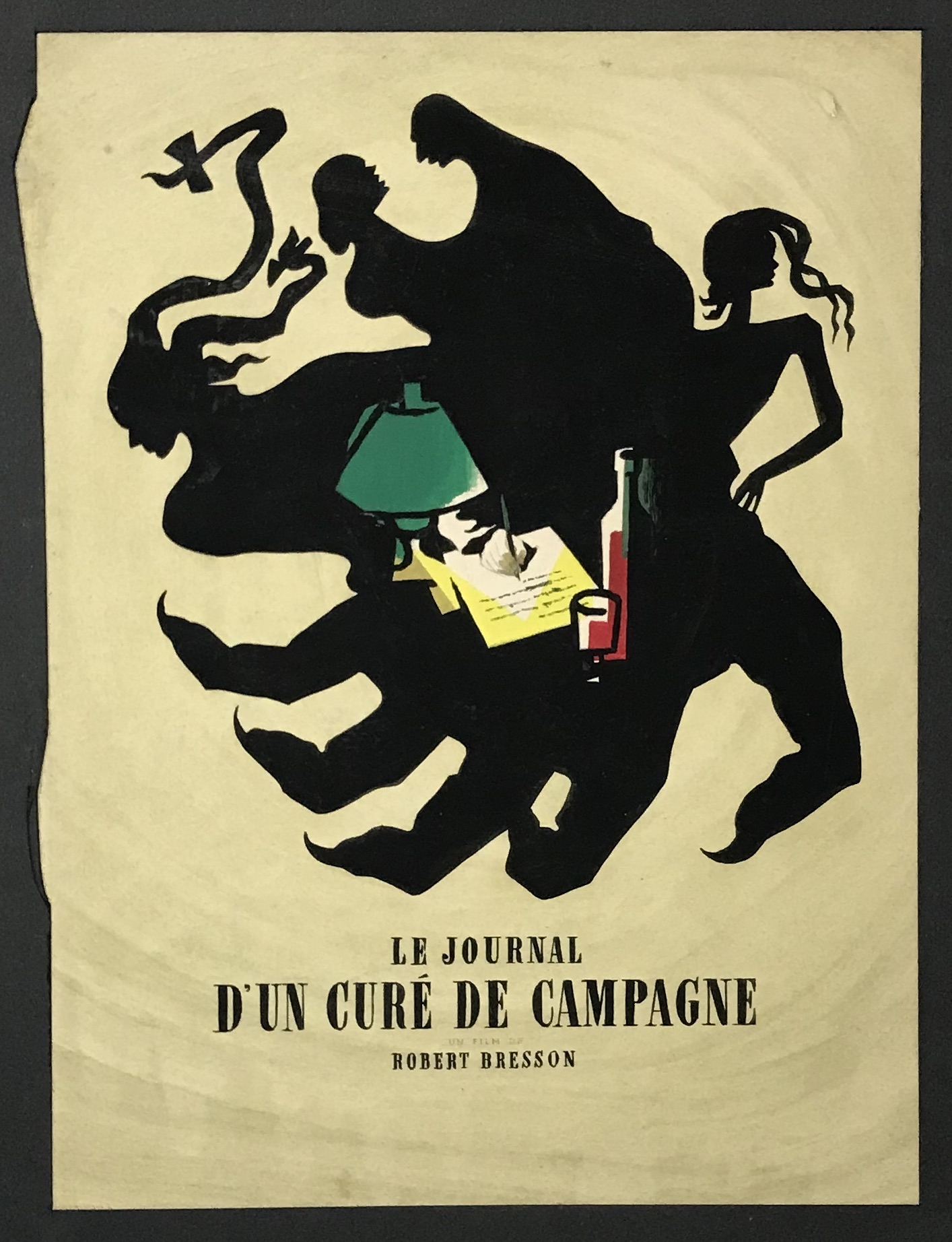 La maquette se distingue par son usage d’aplats sombres, ses contours tranchants et son pouvoir de synthèse dramatique, caractéristiques du style de Jacquelin, qui travailla pour de nombreux films d’auteur dans l’immédiat après-guerre et réalisa de nombreuses maquettes pour les titres de Georges Simenon aux Presses de la Cité. Bien que cette version n’ait pas été retenue pour l’affiche finale du film (sorti en 1951), elle constitue un rare témoignage du processus créatif autour de ce film majeur du cinéma français.