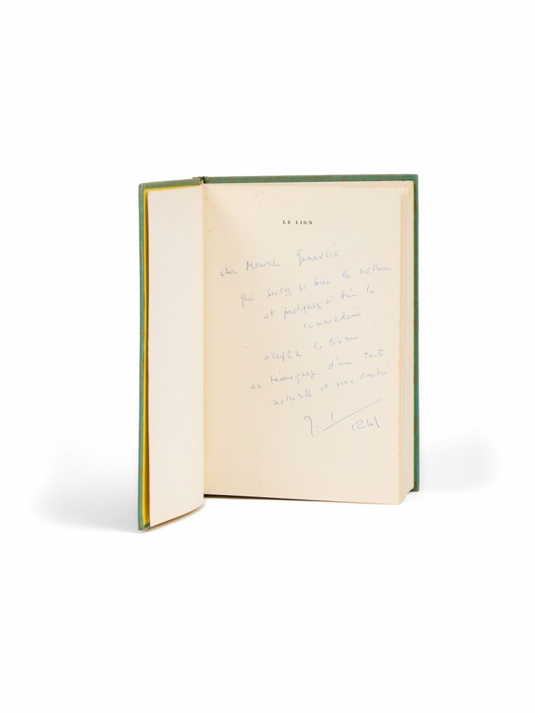 Exemplaire offert par un académicien à un autre : Kessel y est élu en 1962, non loin du fauteuil de Genevoix, qui y siège depuis 1946 avant d’en devenir le secrétaire perpétuel en 1958. « Tu humanisais merveilleusement la fonction », regrettera Kessel lorsque Maurice Genevoix, avide de liberté pour écrire, en démissionne en 1973. Kessel séjournera plusieurs fois aux Vernelles, la maison de Genevoix près d’Orléans, et préfacera l’édition illustrée de La Boîte à pêche parue chez Rombaldi en 1969, illustrée par Claude Aberlenc : plus qu’une préface, un véritable texte d’hommage.
