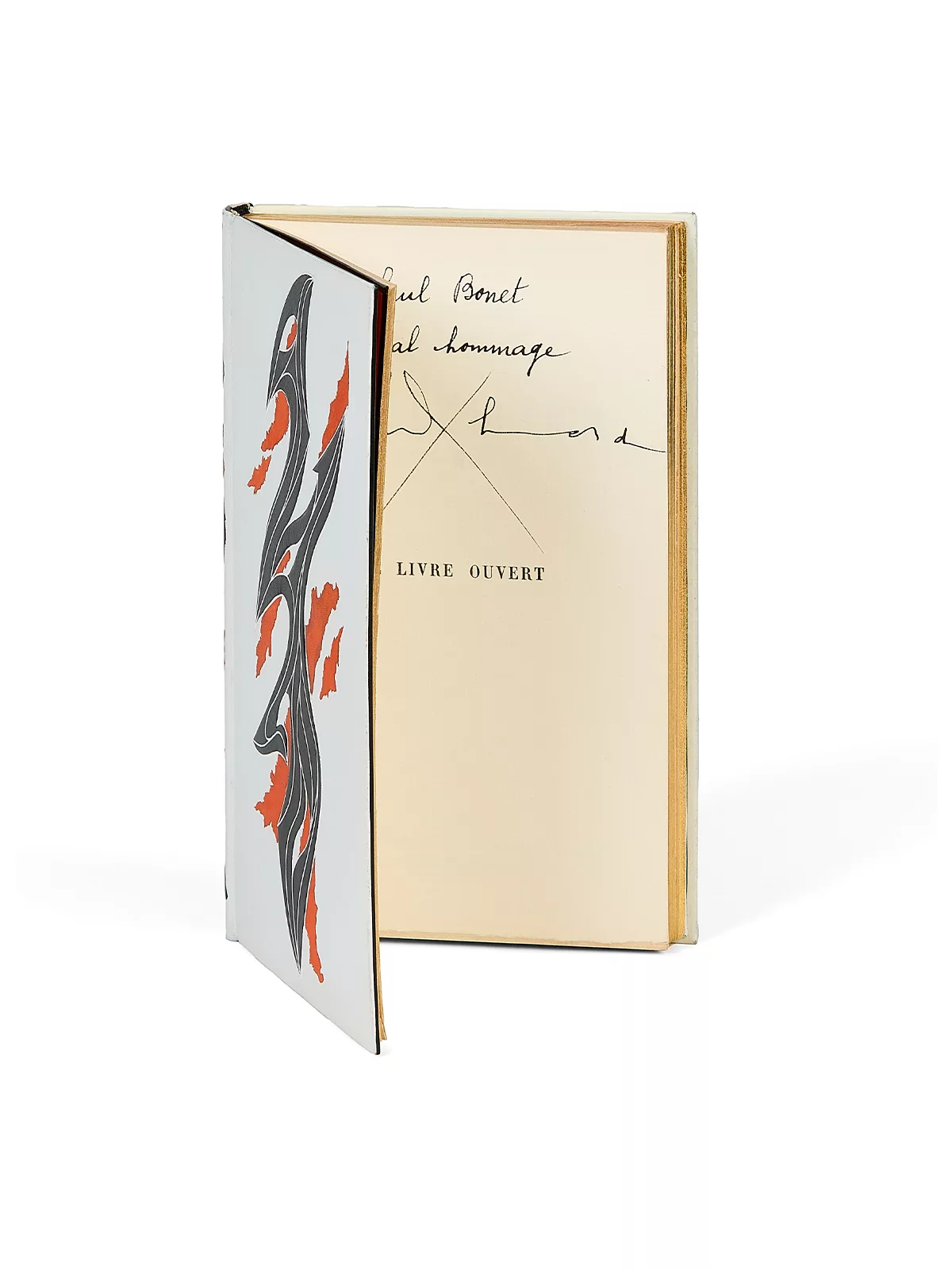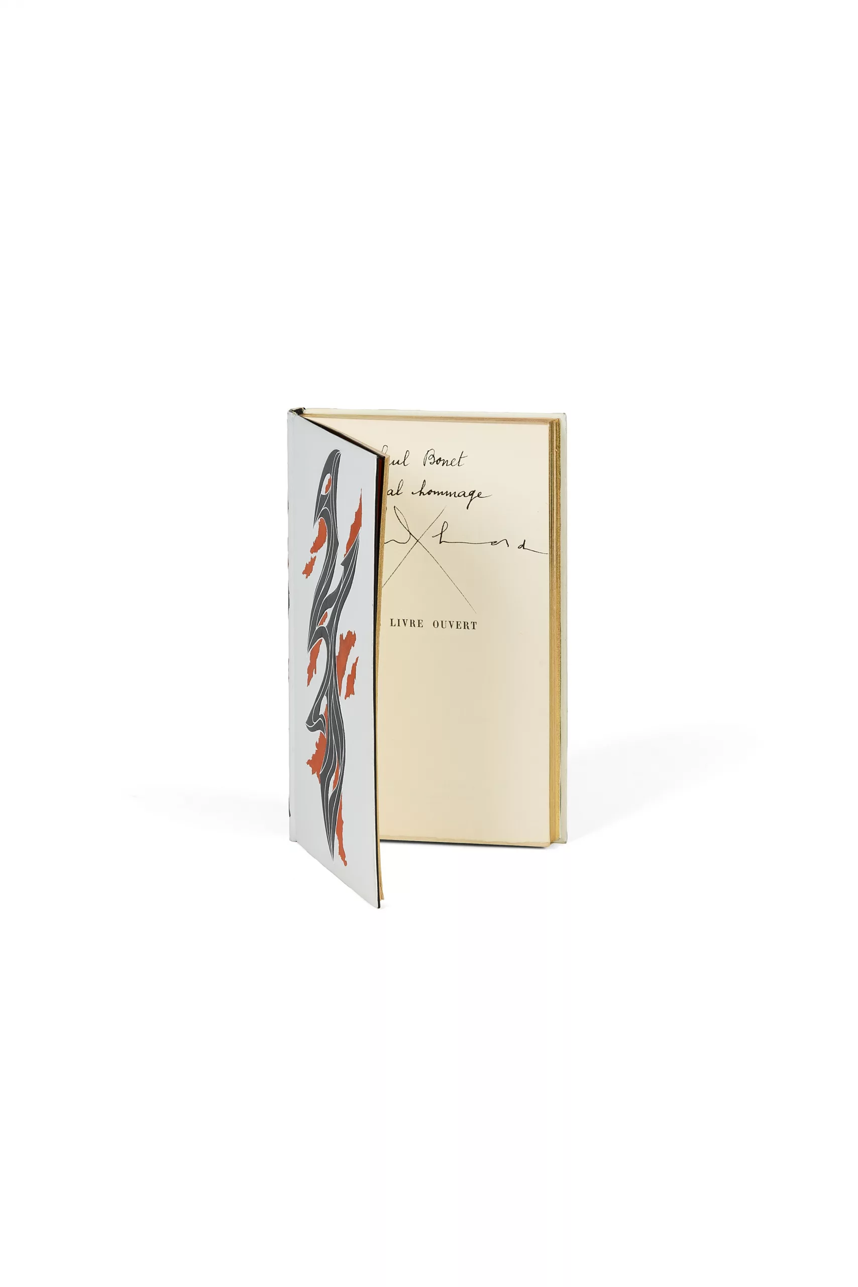 Cette reliure est la seule faite sur le Livre ouvert, après qu’il a relié le manuscrit du projet du Livre ouvert III, à la mort d’Éluard, pour le Professeur Millot. C’est l’une des dernières reliures réalisées par Bonet, établie par René Desmules et doré par Balé. Elle sera terminée, d’après les Carnets, le 23 septembre 1970.