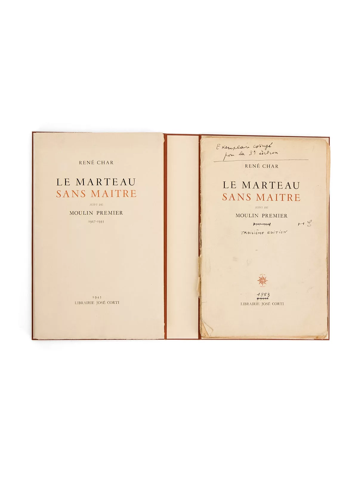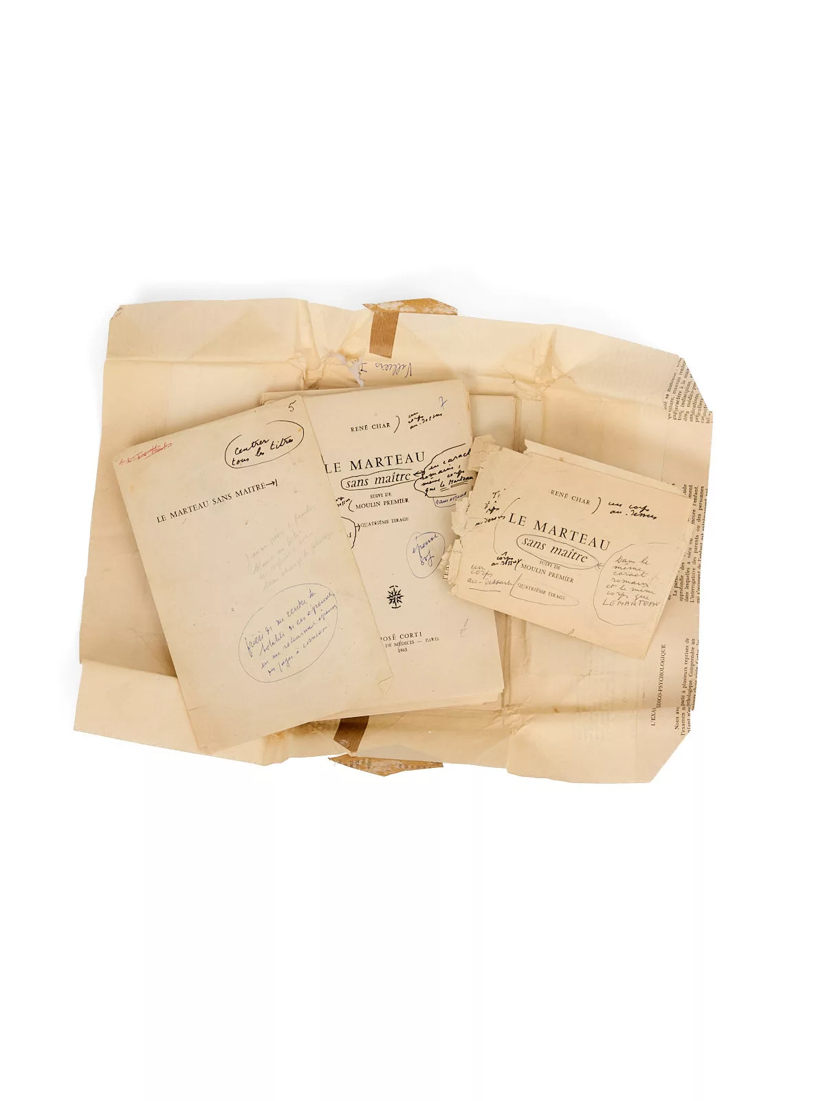 Joint (Vente José Corti, Prado-Falque enchères, 28 juin 2022, lot 23 en partie) : Le marteau sans maître suivi de Moulin premier. Notes pour la troisième édition. Paris, Librairie José Corti, 1945. in-8, en feuilles. Enveloppé dans du papier cristal. Exemplaire tapuscrit complet en pages avec nombreuses corrections et annotations typographiques manuscrites de René CHAR, pour la 3ième édition, parue chez José Corti en 1953. Les corrections ont été faites à partir d’un exemplaire débroché de l’édition de 1945 (1 des 910 numérotés sur surglacé), in-8°. Des corrections, des variantes sont faites, en particulier, Char a refait entièrement la liste de ses oeuvres. Corrections intéressantes.