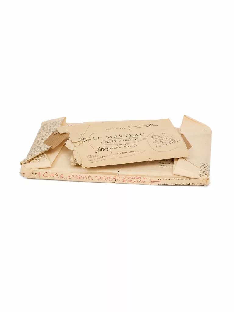 Joint (Vente José Corti, Prado-Falque enchères, 28 juin 2022, lot 23 en partie) : CHAR, René. Le marteau sans maître suivi de Moulin premier. Paris, Librairie José Corti, 1963. in-8, en feuilles. Enveloppé dans du papier cristal.Exemplaire tapuscrit complet en pages, in-8°, de la 4ième édition, parue en 1963 chez José Corti avec quelques corrections typographiques et 2 variantes, à l’encre de René Char, également des annotations de José Corti. BEL ENSEMBLE. Annotations essentiellement typographiques de Char