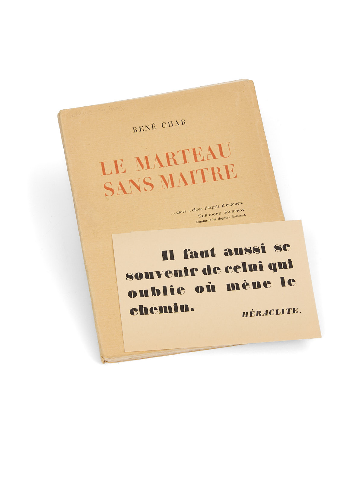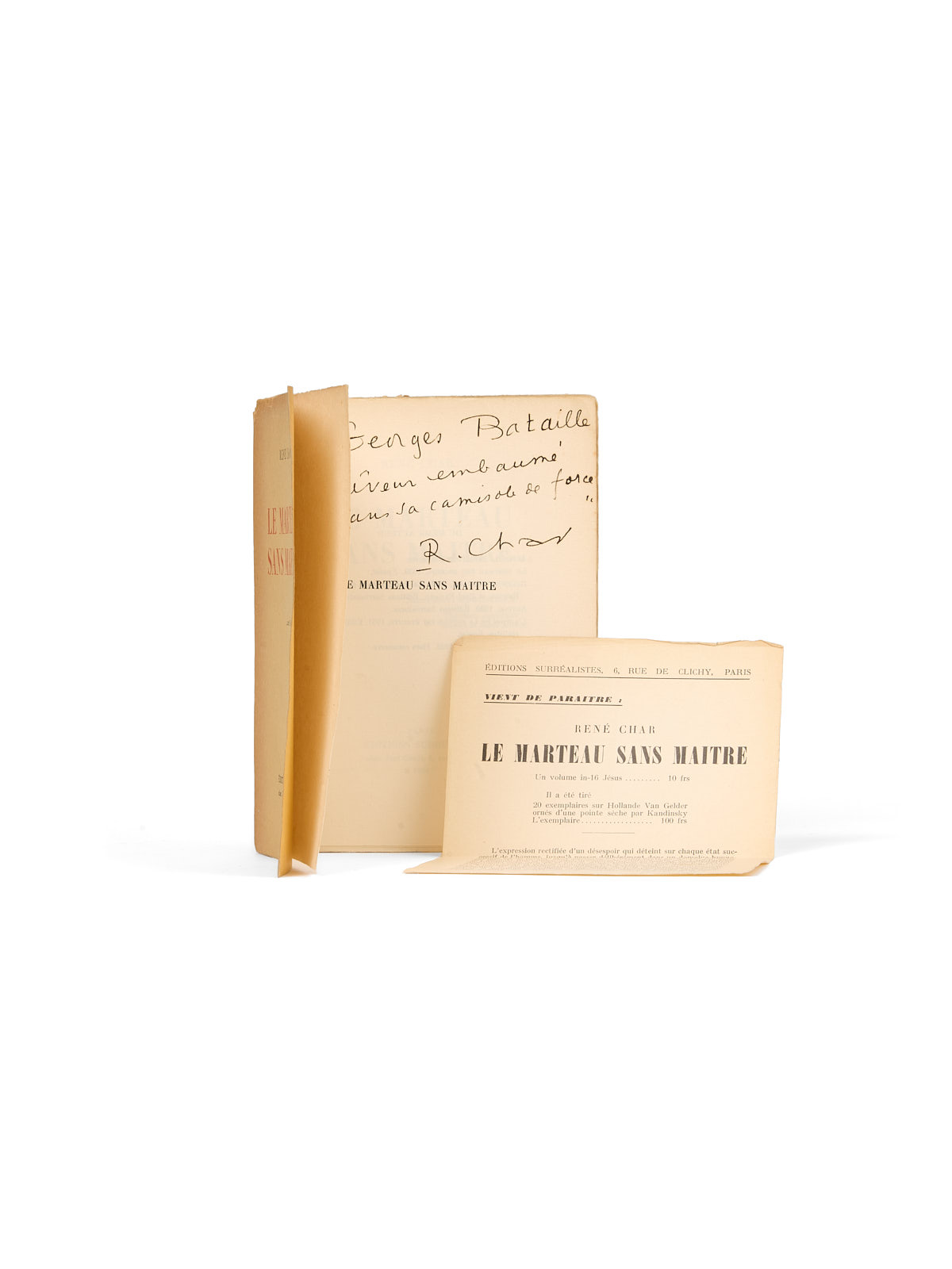 Le Marteau sans maître ici présenté a-t-il été offert postérieurement à sa parution (1934) à Bataille par René Char – peut-être en même temps que le Seuls demeurent ? La teneur des deux envois, « intime de l’homme abrupt dans sa prison » et « rêveur embaumé sans sa camisole de force » le laissent penser. Le choix du Marteau sans maître, comme oeuvre choisie par Char pour lui témoigner sa première période, n’est pas anodin, et des plus parlants, pour un texte qui, après Arsenal et Artine, lui tient particulièrement à coeur. « Toutes les pensées qu’il y a dans Le Marteau sans maître, je n’en parlais jamais à personne, pas même à mon intime Éluard. C’est une révolte que j’ai vécue seul sans communiquer », confiera-t-il à Paul Veyne, à un moment où il se détache du mouvement surréaliste dont il ne fut qu’un passager locataire.
