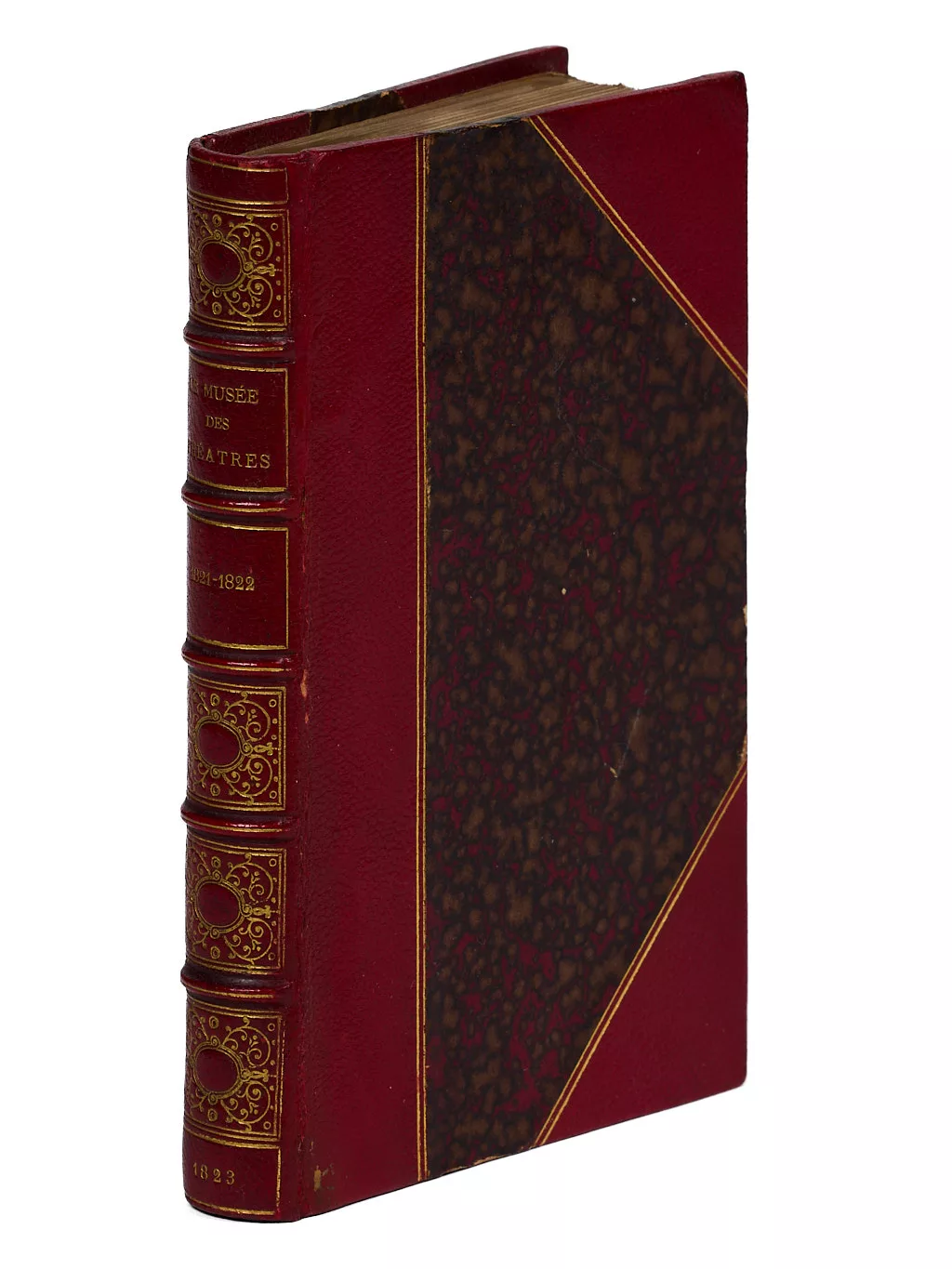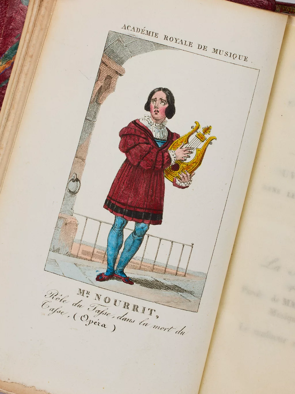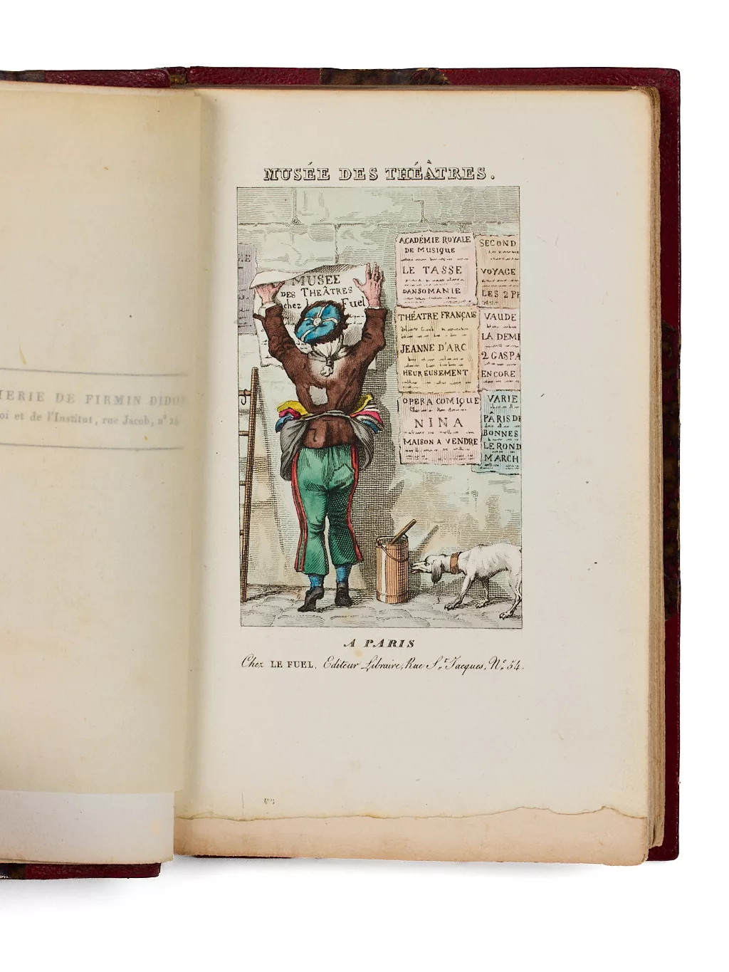 Ravissant almanach théâtral avec le programme des théâtres parisiens pour l'année 1822. Il est orné d'un titre-frontispice montrant un colleur d'affiches et de 12 portraits de comédiens, gravés sur acier et finement aquarellés à la main, ici en double état (en noir et aquarellé) : Nourrit, Martin, Mme Lemonnier, Mme Perrin, Philippe, Mlle Rivière, Odry, Mlle Flore, Le Peintre, Potier, Mlle Jenny-Vertpré. On trouve aussi