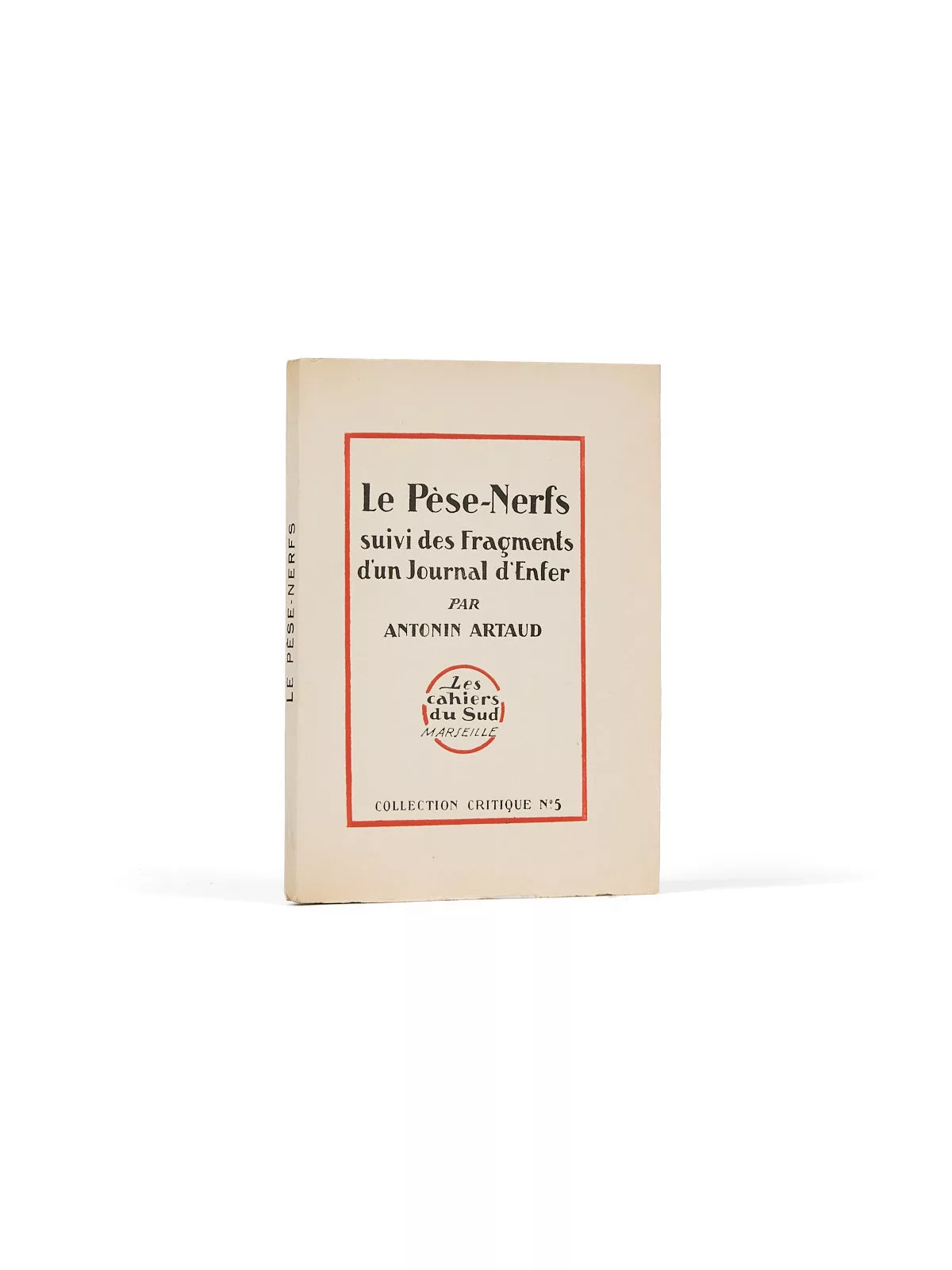 « Toute l’écriture est de la cochonnerie » : une manière, pour Artaud, de dire, après Breton, qu’il réfute la littérature, la pose et l’affectation littéraires, « la gent littéraire ». Contre l’esprit, spécialement celui de système, le corps doit retrouver ses droits. Car la conscience est inaccessible par le langage : « Je suis celui qui a le mieux senti le désarroi stupéfiant de sa langue dans ses relations avec la pensée. » En somme, « pas d’oeuvres, pas de langue, pas de parole, pas d’esprit, rien. Rien, sinon un beau Pèse-Nerfs. Une sorte de station incompréhensible et toute droite au milieu de tout dans l’esprit. ». Rousseurs aux premiers et dernier feuillets.