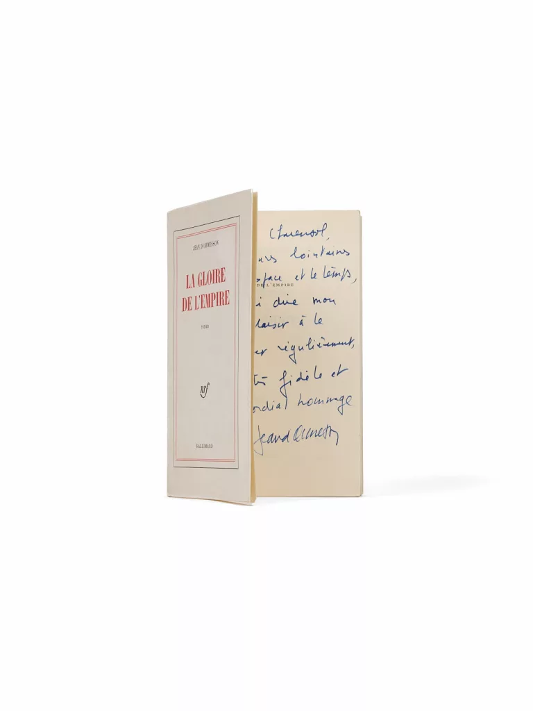 Envoi signé : « Ma chère Suzanne [Genevoix], je me souviens et je vous embrasse, Jean ».