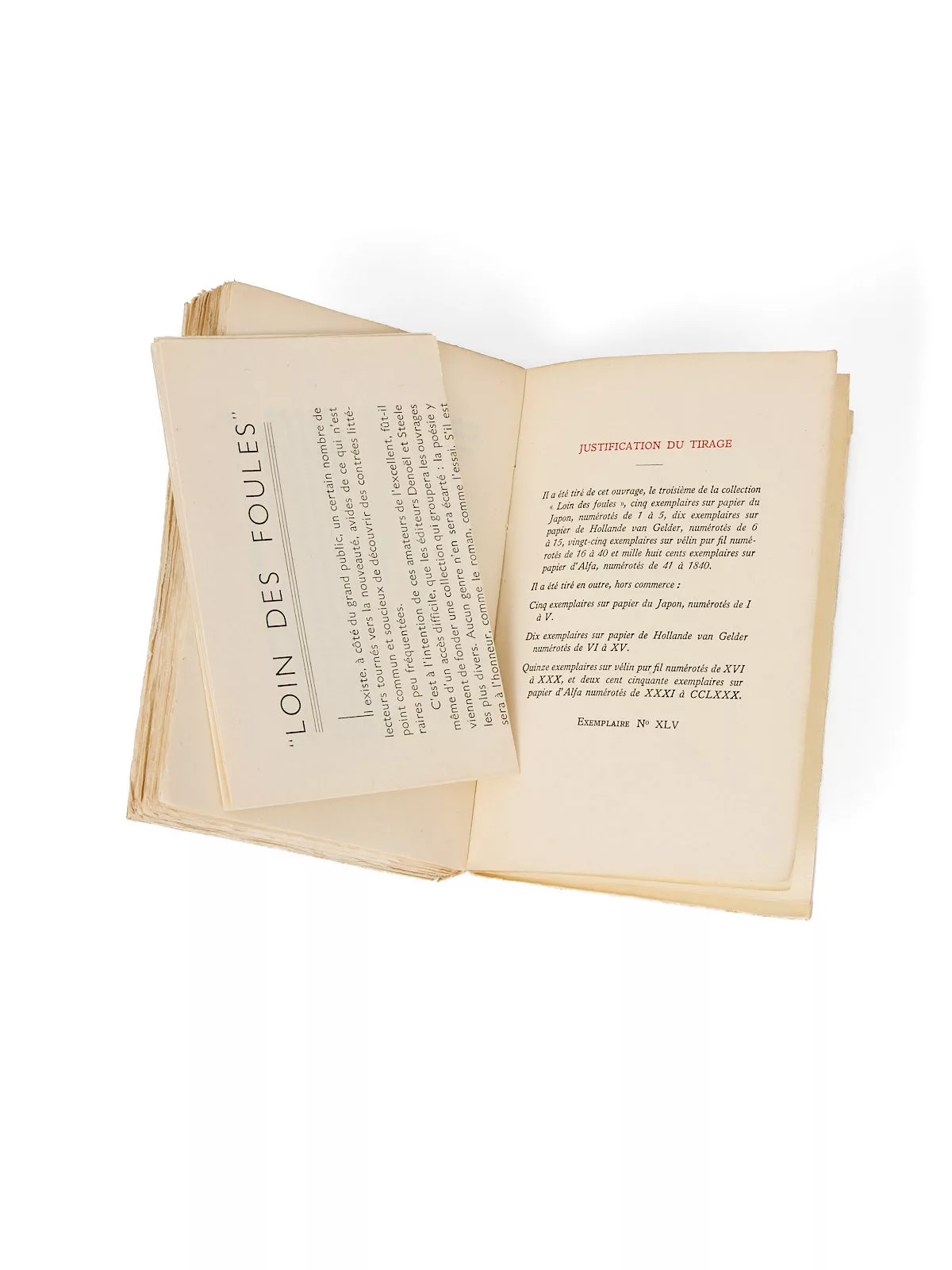Un des 1 800 exemplaires sur alfa, celui-ci hors-commerce (n° XLV) - enrichi du rare bulletin de souscription et d'annonce de la collection « Loin des foules ».