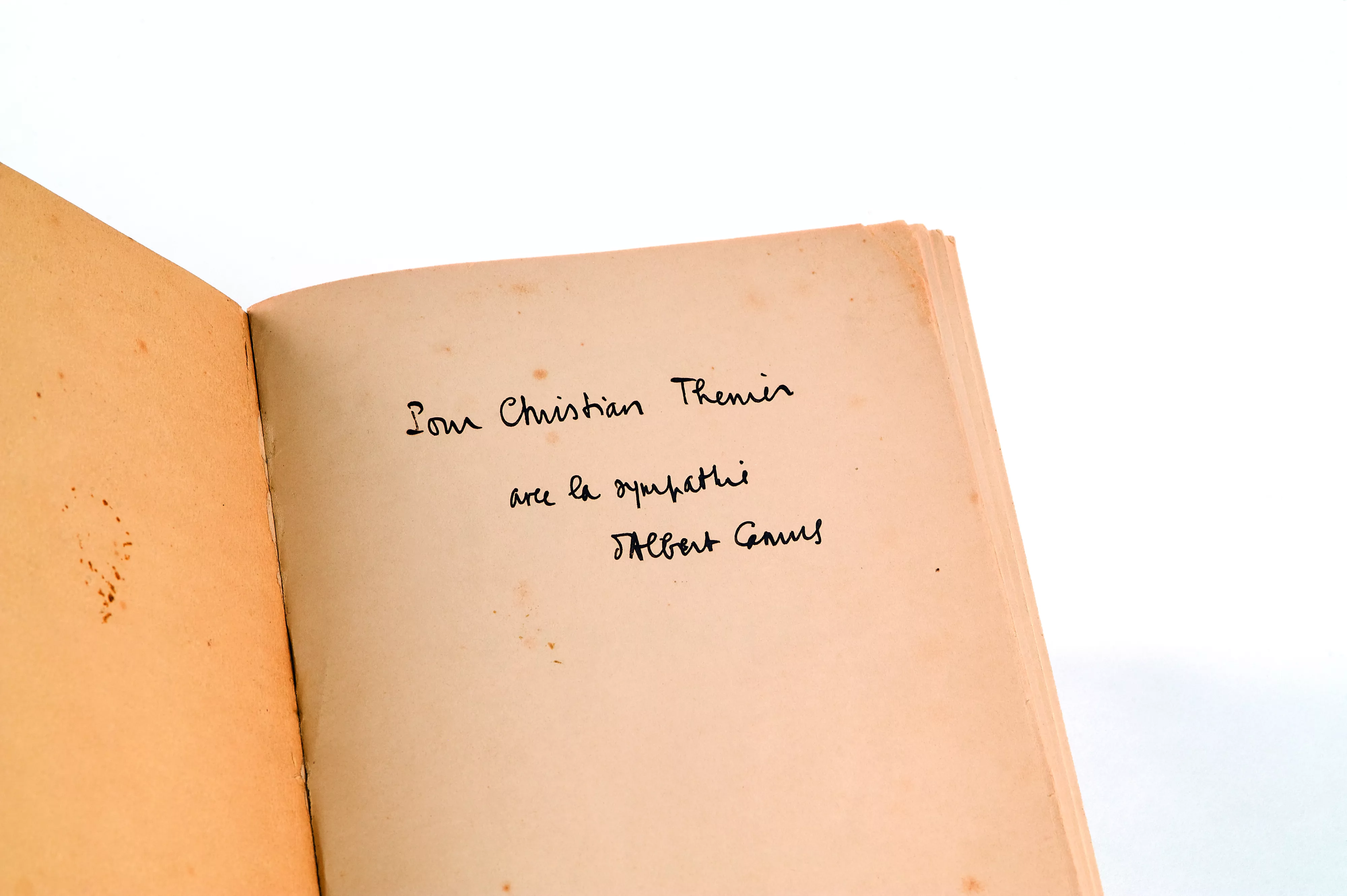 On ne connaît qu’une poignée d’exemplaires avec envoi – seuls trois sont identifés. Notre exemplaire a été offert, sans doute dès sa parution, en mai 1937, à un « voisin » de Camus, Christan Thenier : son commerce était situé au 9, rue de Tanger, à quelques centaines de mètres de la librairie d’Edmond Charlot, rue de Charras, et entre le domicile de Camus, rue de Lyon, et celui de l’oncle Acault, rue Michelet : un parcours et des rues que Camus ne cesse d’emprûnter au quotidien et une provenance tout à fait intéressante et particulièrement adéquate pour le fils du quartier de Belcourt, capable de ressusciter les soirs d’été d’Alger, quand tous les voisins se mettaient au balcon, partageant entre eux « une solitude dans la pauvreté qui rend son prix à toute chose ».« Edité à Alger, peu diffusé pendant la « drôle de guerre », l’Envers et l’Endroit tarde à bénéficier, après la Libération, du succès de L’Etrangeret du Mythe de Sisyphe. Camus finit donc, en 1958, par en accepter la réédition. Elle est pour lui l’occasion de reconsidérer, dans une préface substantielle, le temps déjà accompli de sa carrière. S’il juge sévèrement, quant à la forme, des essais écrits à l’âge où « l’on sait à peine écrire », il y salue chaleureusement « la source unique que chaque artiste garde au fond de lui ». Il dégage mieux, à présent, la leçon des « voix des quartiers pauvres », « à mi-chemin de la misère et du soleil », alors qu’il a découvert, à Paris, « la double humiliation de la misère et de la laideur » ».
