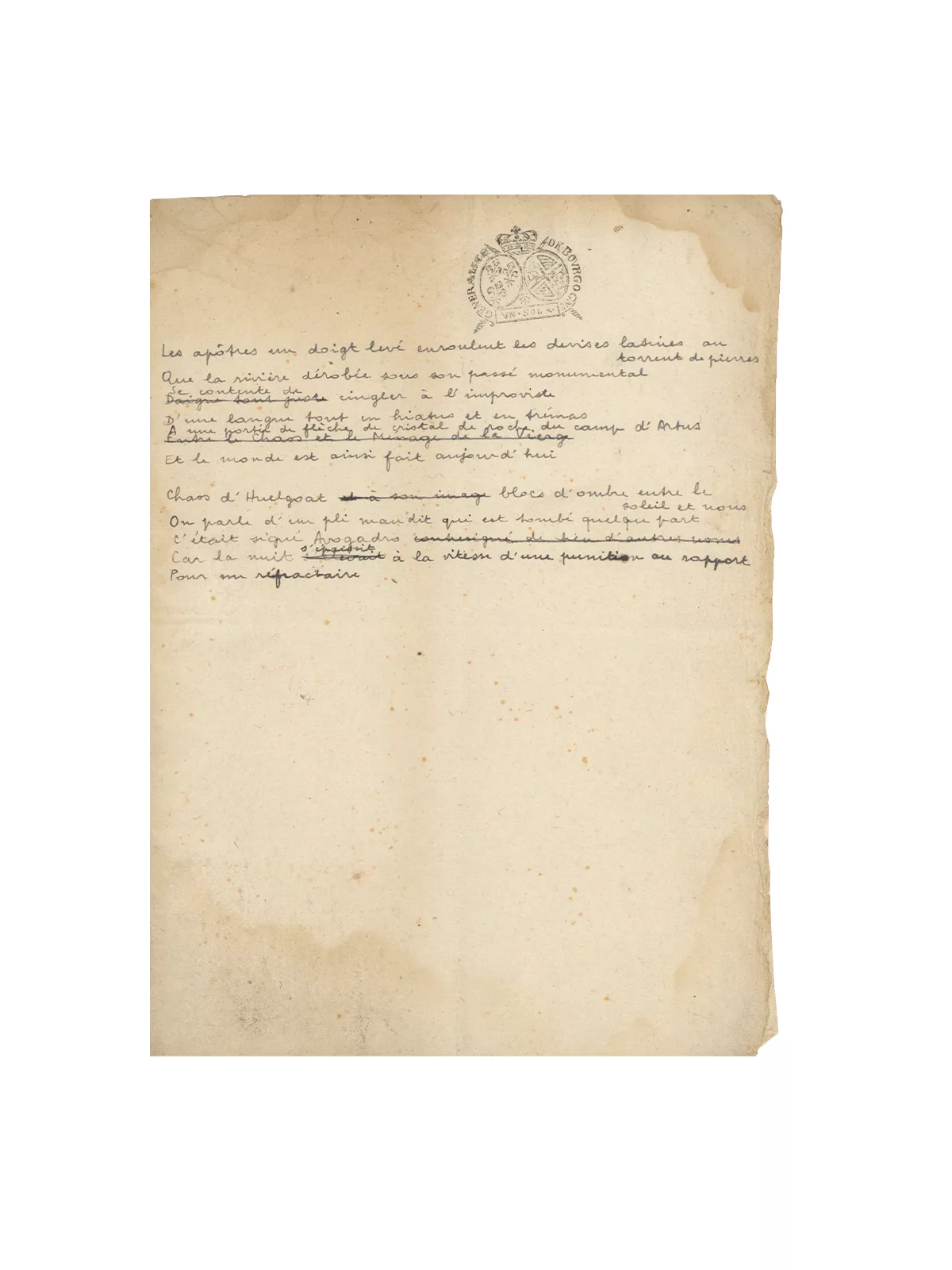 Étienne-Alain Hubert, dans les Oeuvres complètes, date ce texte de 1946. Il est rédigé sur un papier ancien de réemploi, strictement identique à celui que Breton a utilisé pour répondre à un article de René Huyghe paru dans Les Cahiers du Sud de mars 1952. Il s’agit d’un classique papier timbré avec le cachet des armes de France et de Bourgogne accolées, la couronne royale et deux épées et la légende « Génnéralités de bourgogne » et dans le cartouche la valeur du tarif, ici vingt sol. Ce papier était à l’usage des documents administratifs.