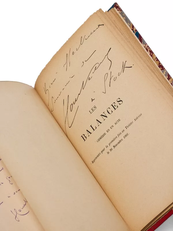 C’est précisément Antoine qui mettra en scène Les Balances, pièce qui concentre tous les sujets chers à Courteline ; la pièce sera montée pour la première fois le 26 novembre 1901. Quand il décidera de réunir ses oeuvres c’est à son éditeur attitré, Flammarion que Courteline fera appel. En 1912, il travaille alors à la parution de ses oeuvres complètes. Mais Courteline a noué depuis longtemps des liens d’amitité avec l’éditeur Pierre-Victor Stock (dédicataire de cet exemplaire) héritier de la célèbre maison Stock, qu’il dirigea de 1877 à 1921. Celle-ci, dont l’adresse est tout près du Palais-Royal édite très majoritairement à cette époque le théâtre qui se joue à Paris.