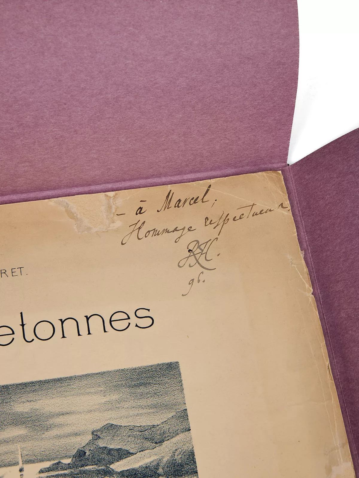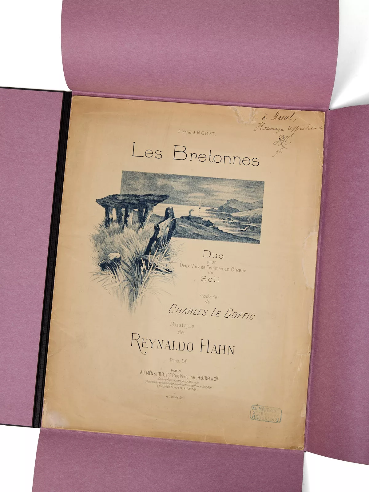 Ce choeur n’avait jamais été repris depuis et encore moins publié, ce que Hahn voulait absolument rectifier. L’année 1896 est l’une des plus prolixes, avec onze lettres de Proust à Hahn. Une seule, dans l’autre sens, est connue pour cette année là. Durant les 29 années où les deux protagonistes se sont écrit, on trouve, pour Marcel Proust, environ 200 lettres et pour Reynaldo Hahn, le chiffre dérisoire de… 12 ! Une seule, écrite le 21 mai 1896, concerne la mésentente sentimentale qui amènera à la rupture de l’été. Les onze autres, de 1897 et 1922, amicales, sans grand intérêt. Cette dédicace sur Les Bretonnes fait donc partie des rares missives envoyées par Hahn à Proust — et peut-être même la première connue puisque l’impression des Bretonnes date de février 1896, trois mois avant la première lettre de Hahn à Proust. Même si le ton est tout en distance l’envoi peut laisser penser qu’il a été fait après la rupture amoureuse de l’été.