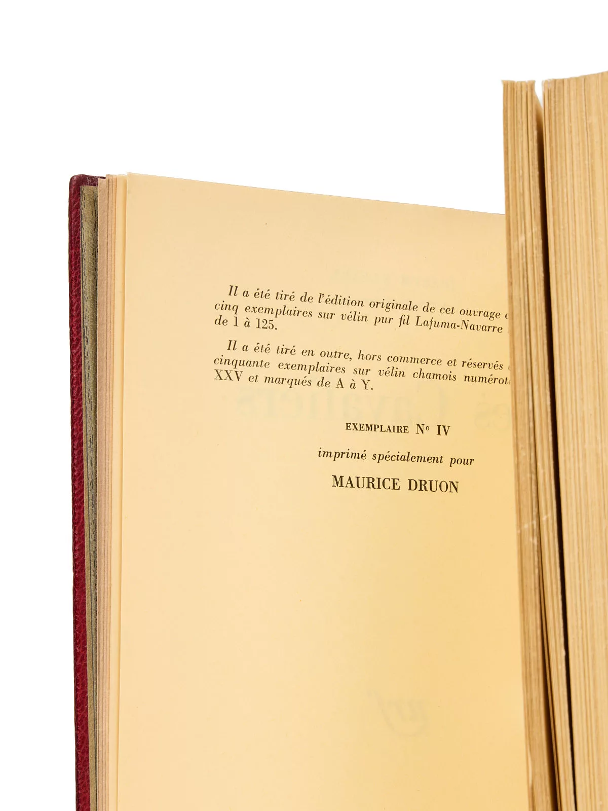 De la bibliothèque Maurice Druon (ex-libris) et justification nominative.