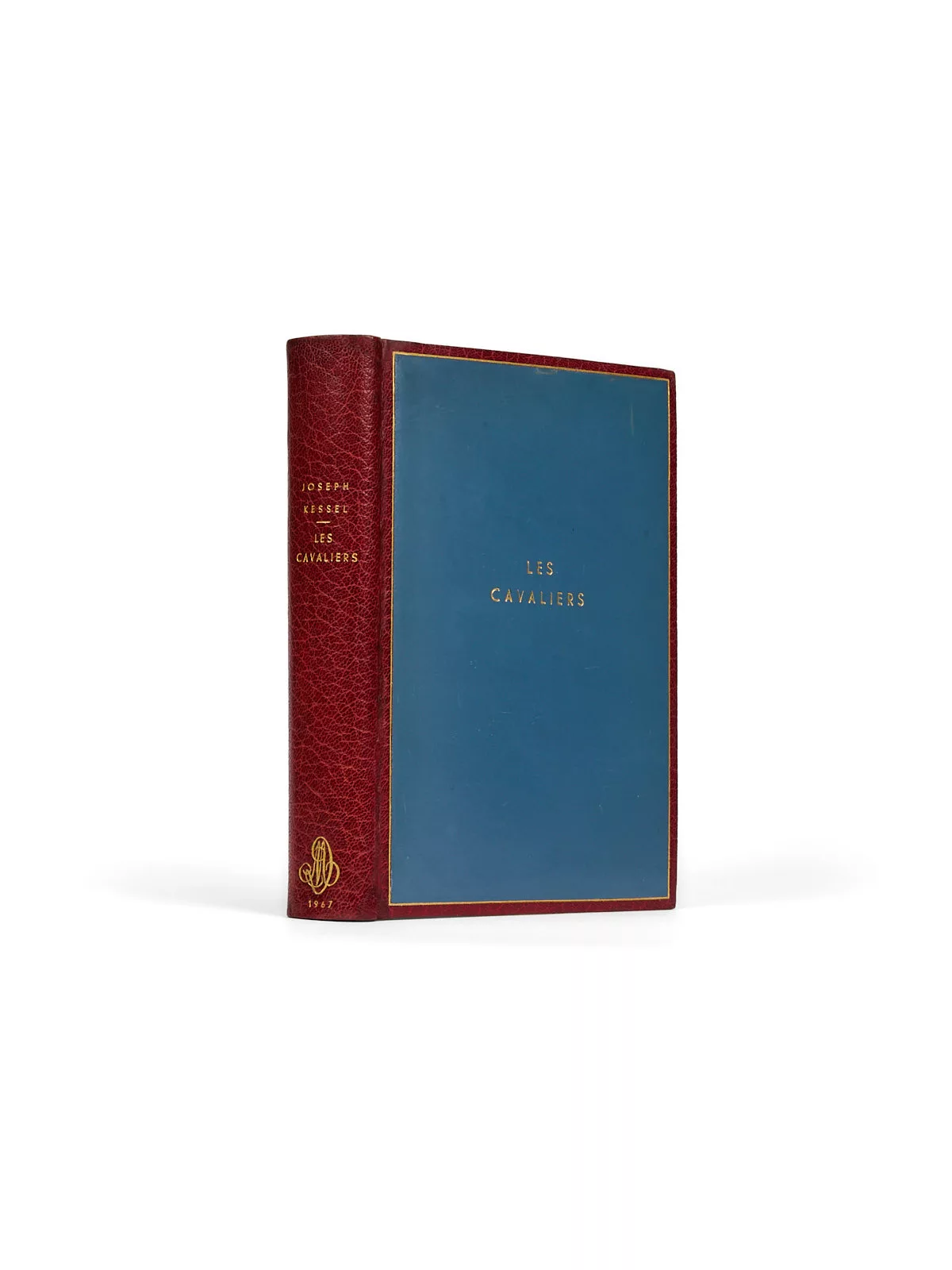 La reliure est au chiffre « M.D. » en pied des volumes, dans une parfaite et remarquable exécution de l’atelier d’Alix mère, à l’identique des plus précieux exemplaires établis et conservés ainsi par Druon : Le Tour du malheur (1950), Le Lion (1958, pour deux volumes) et ces Cavaliers.