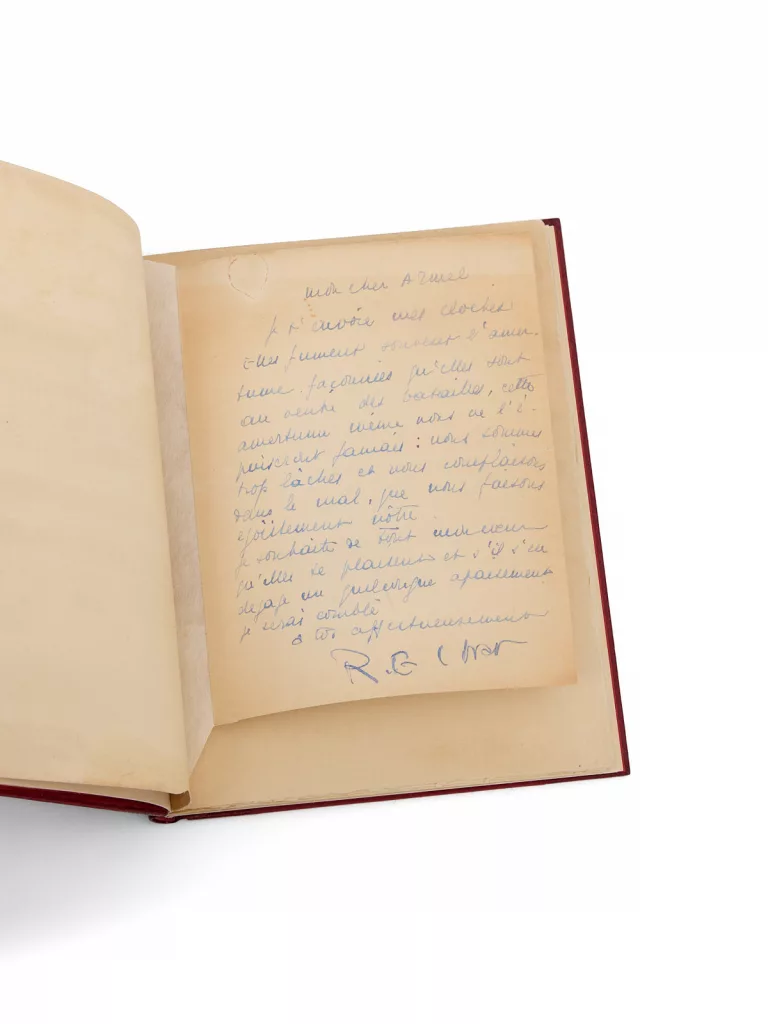 Envoi signé : « Pour mon ami Armel Ferrand, ces cloches de quatre saisons (sentimentales, sensuelles, lasses et sanguinaires) en sympathie toute amicale de René E. Char. Nîmes, 30 juillet 28 ».